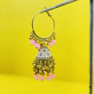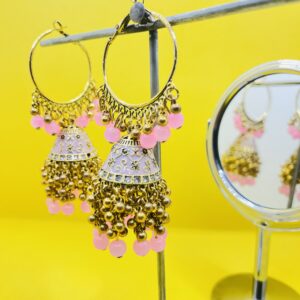 Elegant Pink Enamel Jhumka Hoop Earrings with Gold Ghungroo & Bead Accents