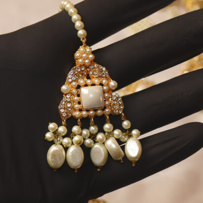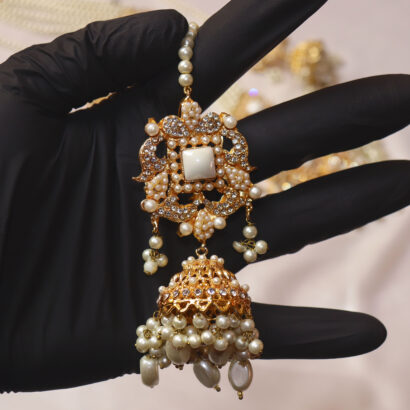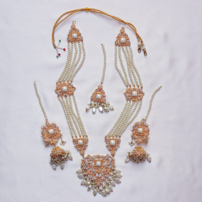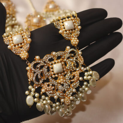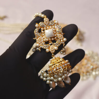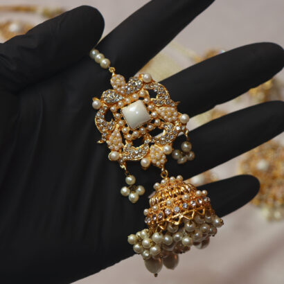 The grand centerpiece necklace features a dazzling pendant adorned with sparkling stones and delicate pearl drops, complemented by symmetrical multi-strand pearl arrangements. The set includes majestic Jhumka earrings, a graceful Tikka for the forehead, and stunning side jhumar/passa-style elements that drape beautifully, completing a truly regal look. Each piece is a masterpiece of craftsmanship, designed to make you feel like royalty on your most special day or at any grand celebration. Embrace the blend of traditional charm and contemporary sparkle with this unforgettable ensemble.
