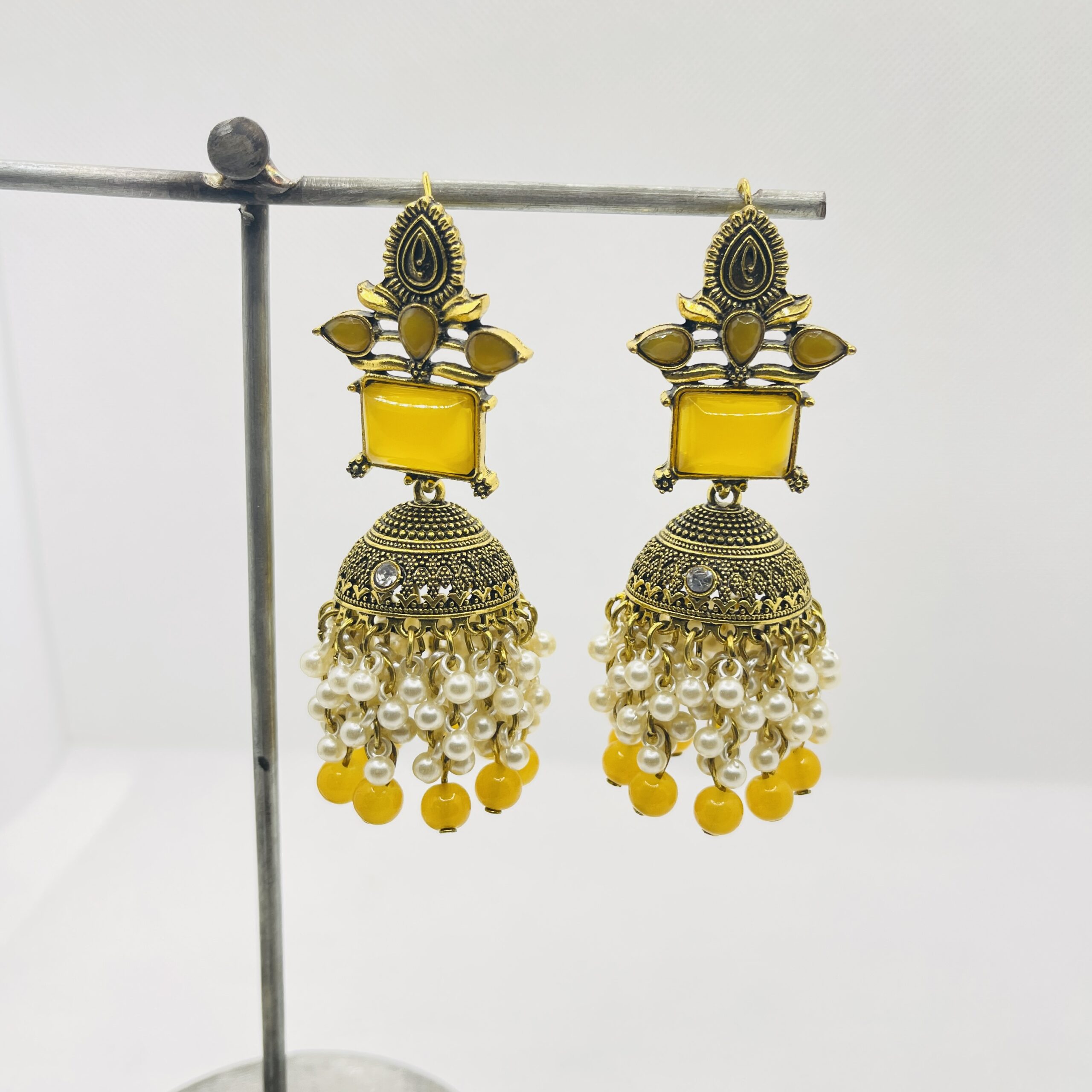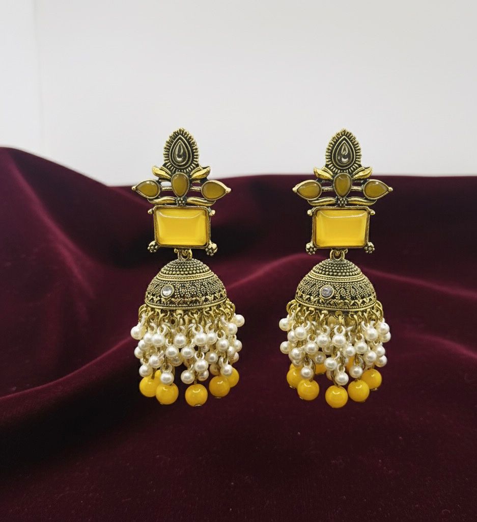 Brighten your festive wardrobe with these stunning Yellow Stone Jhumka Earrings. Crafted with an antique gold finish, these traditional bell-shaped earrings feature a bold rectangular yellow center stone and a delicate fringe of white pearls and yellow beads. They are the perfect lightweight accessory for weddings and traditional celebrations.