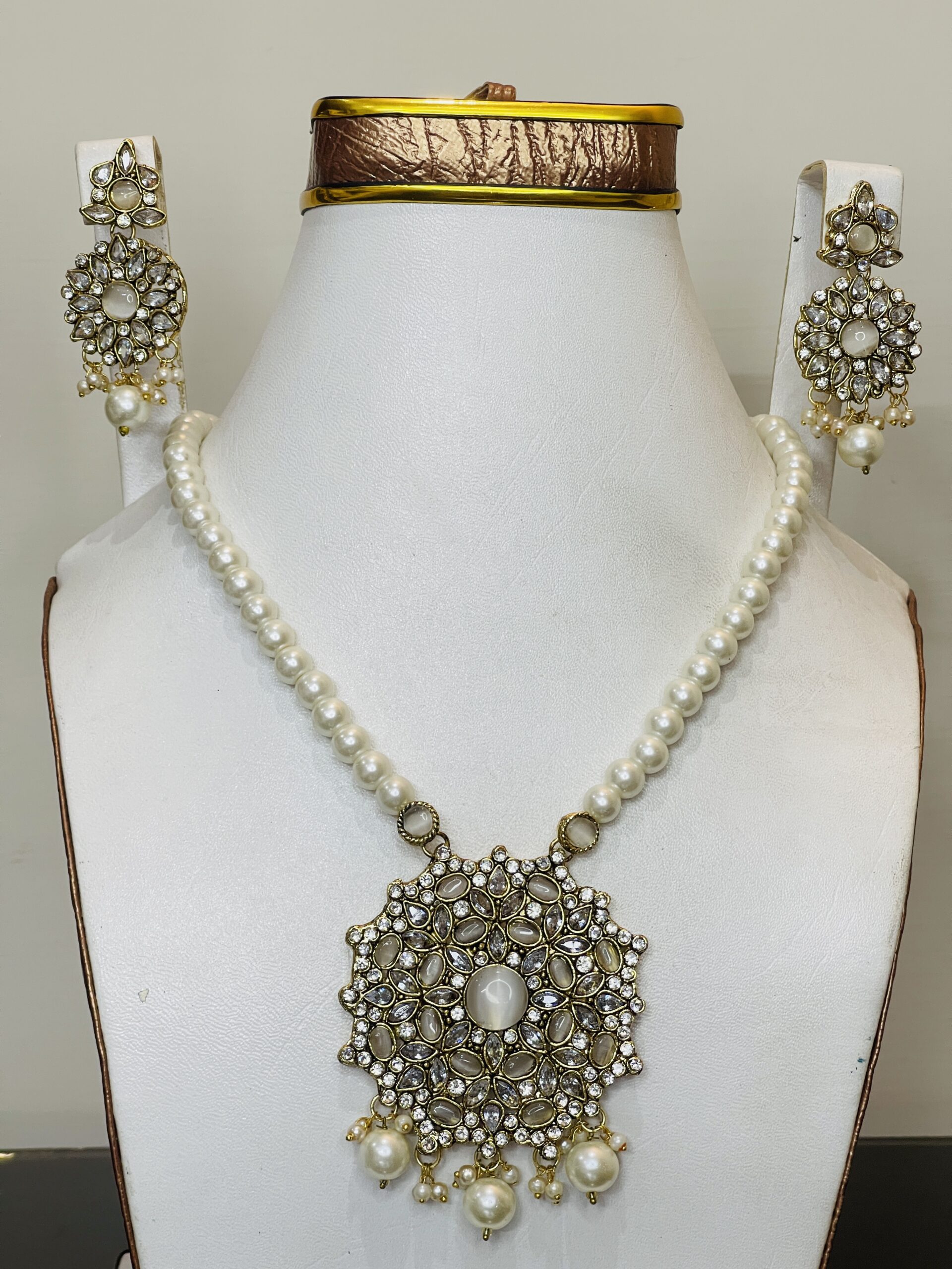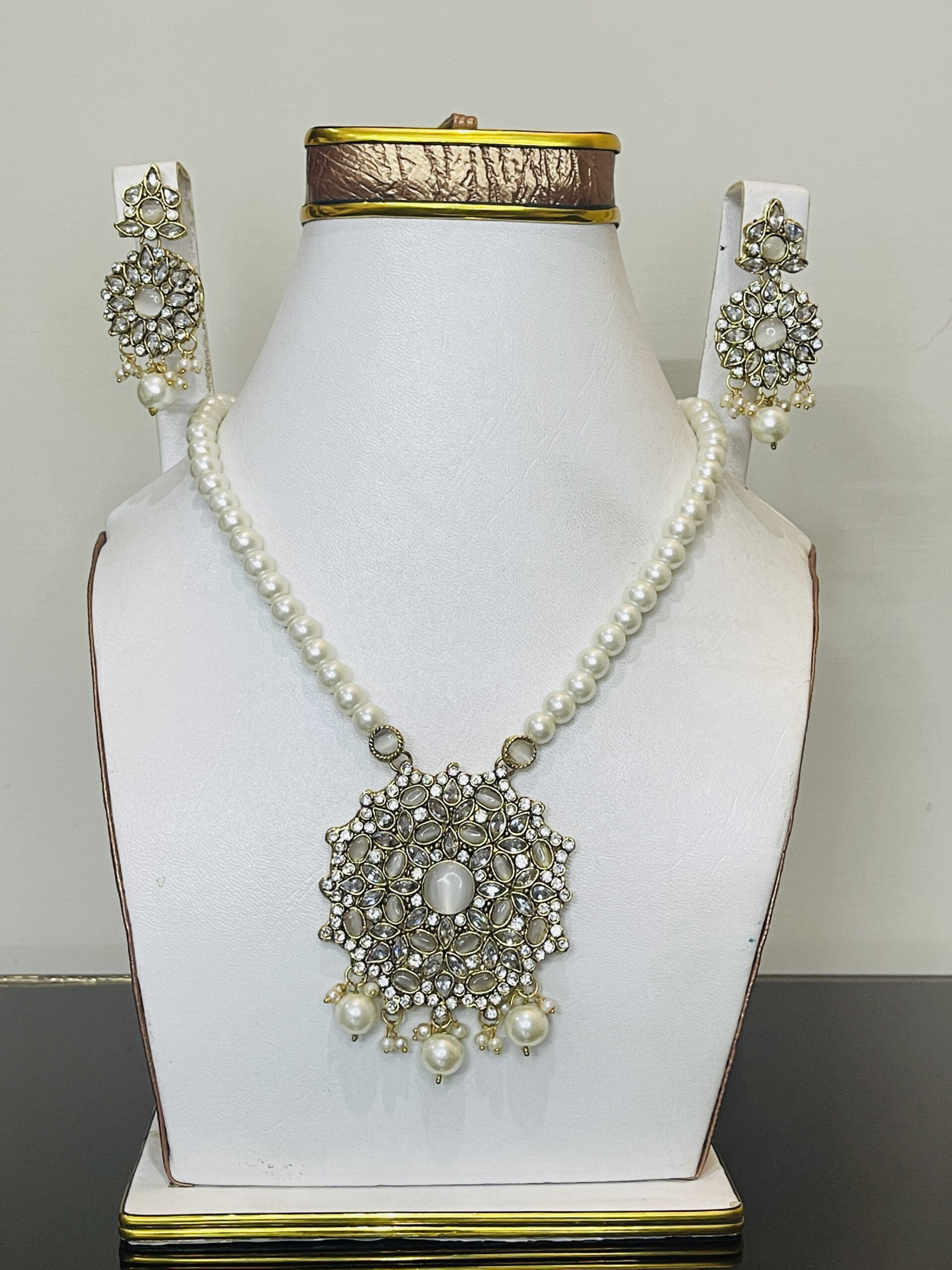 Authentic Kundan necklace set with pearl strand, handcrafted pendant, and matching earrings—perfect for weddings and bridal wear.