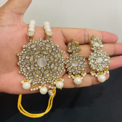 Experience true heritage luxury with this authentic Kundan necklace set, crafted with precision and timeless artistry. The necklace features a lustrous strand of high-quality pearls, beautifully complemented by a handcrafted round Kundan pendant. The pendant showcases intricate stone inlay work with a central gemstone, surrounded by delicate detailing and finished with classic pearl drops that enhance its regal charm.