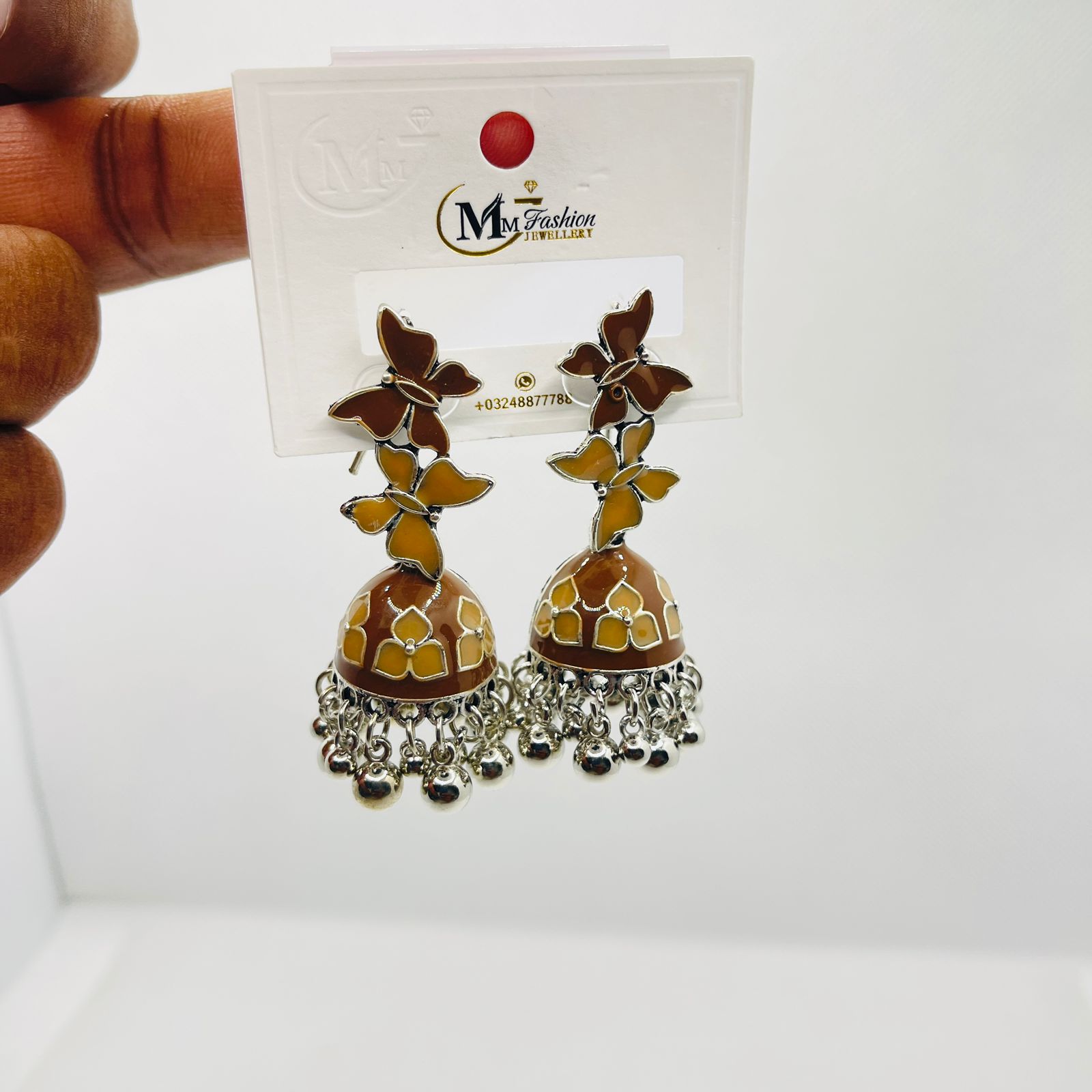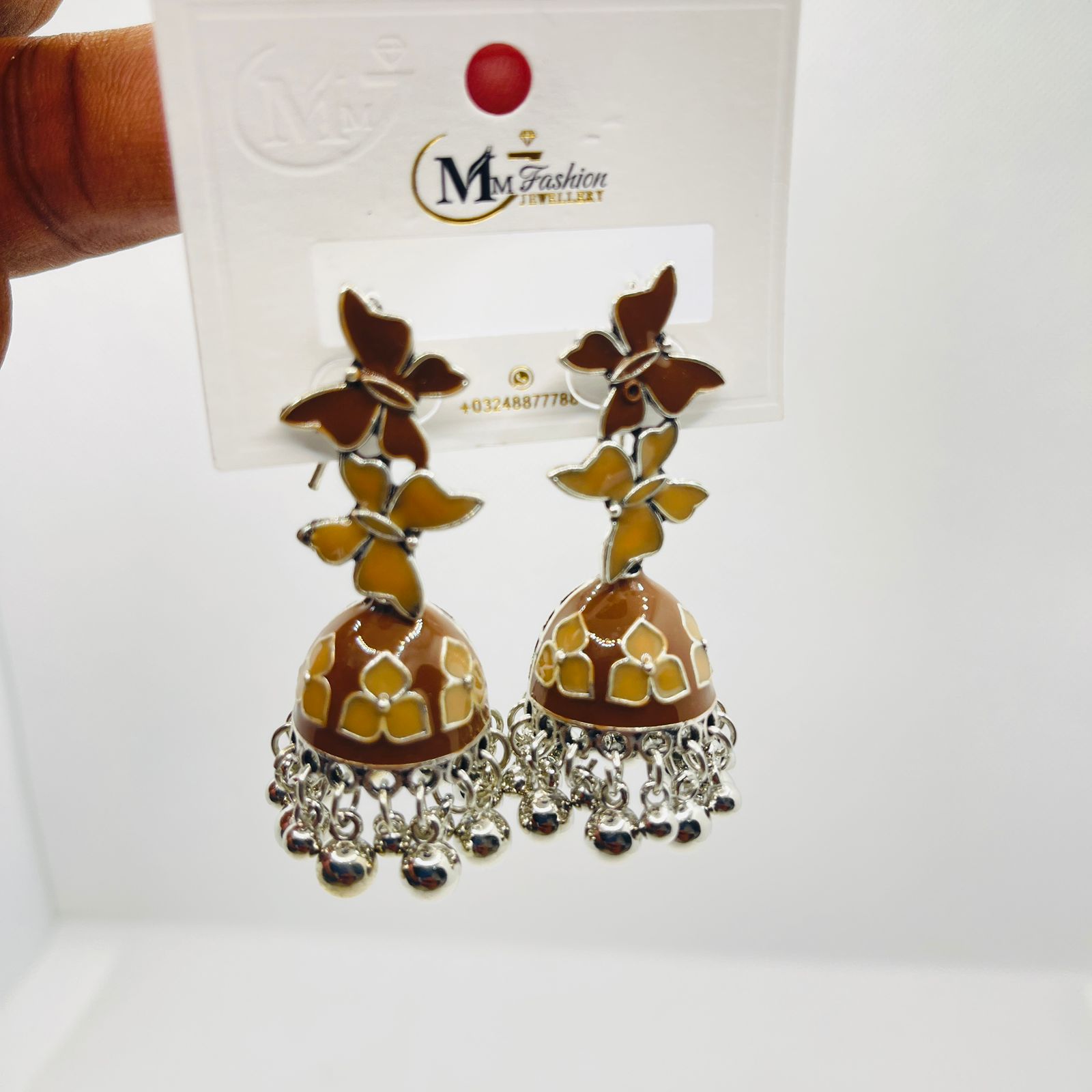 Elevate your ethnic wardrobe with these unique Butterfly Meenakari Jhumkas. Featuring a whimsical double-butterfly stud design and a classic bell-shaped drop with intricate floral enamel work, these earrings perfectly blend contemporary charm with traditional craftsmanship. Lightweight and stylish, they are the ideal accessory for festive occasions or everyday elegance.