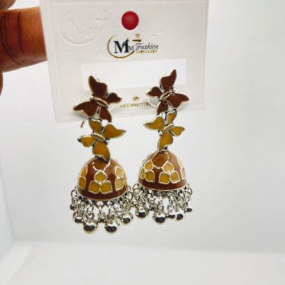 Discover the perfect harmony of nature-inspired design and heritage jewelry. Our Butterfly Double-Layer Meenakari Jhumkas are designed for the modern woman who loves a touch of playfulness in her traditional attire. The rich brown and mustard-gold tones offer a sophisticated earthy palette that complements a variety of outfits.