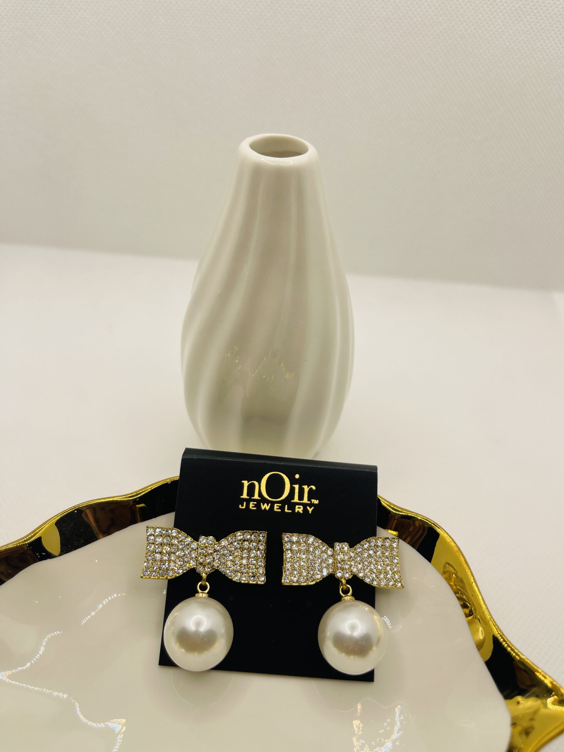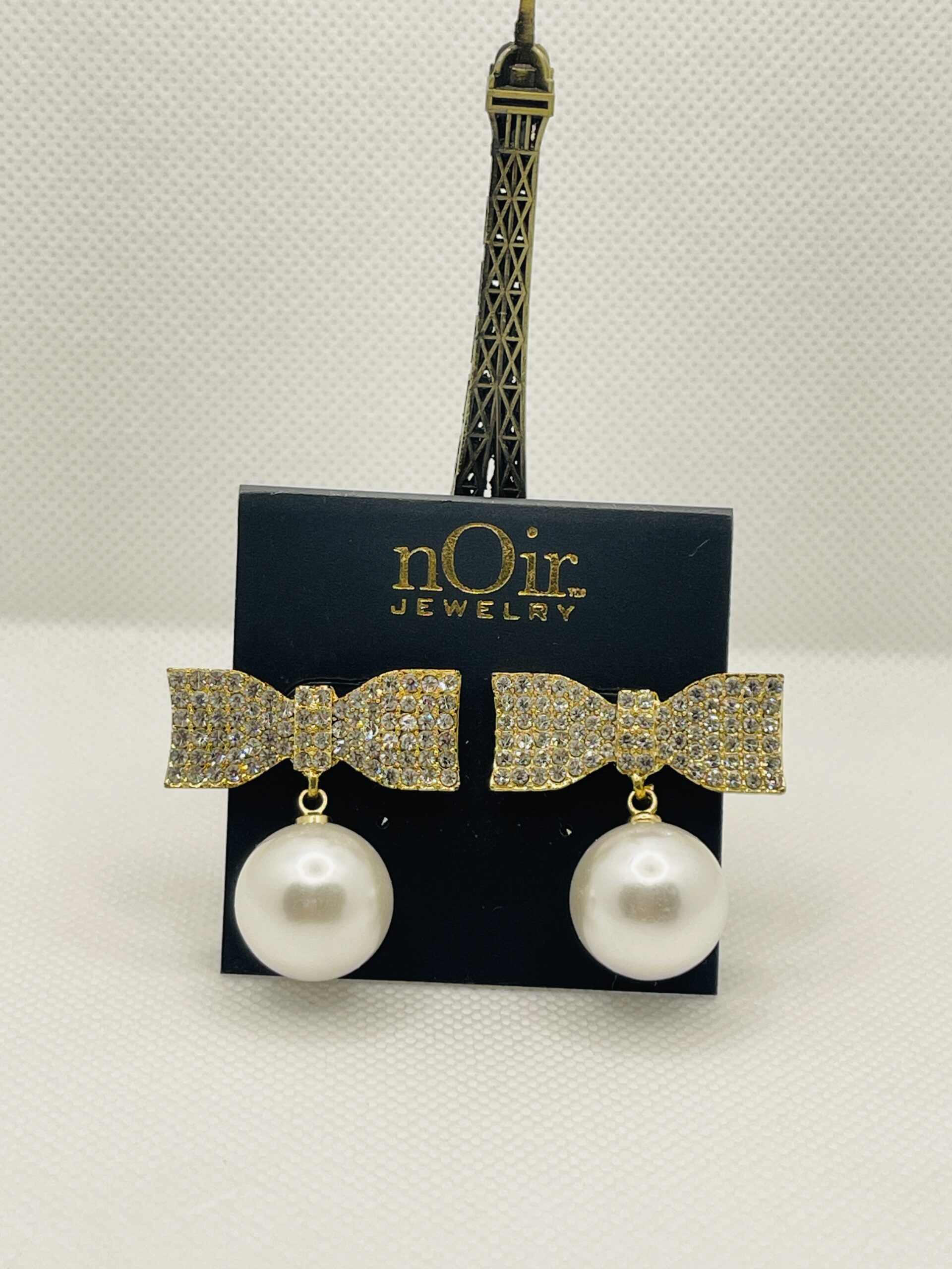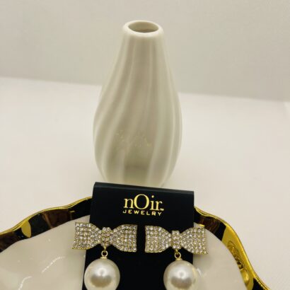 Add timeless elegance to your jewelry collection with these Gold Bow & Pearl Drop Earrings from Noir Jewelry. The top features a dazzling bow encrusted with shimmering crystals, symbolizing charm and sophistication. A luminous pearl drop hangs gracefully below, creating a classic yet modern look. Lightweight and versatile, these earrings are ideal for bridal wear, festive occasions, or gifting someone special.