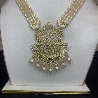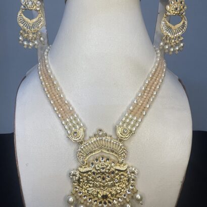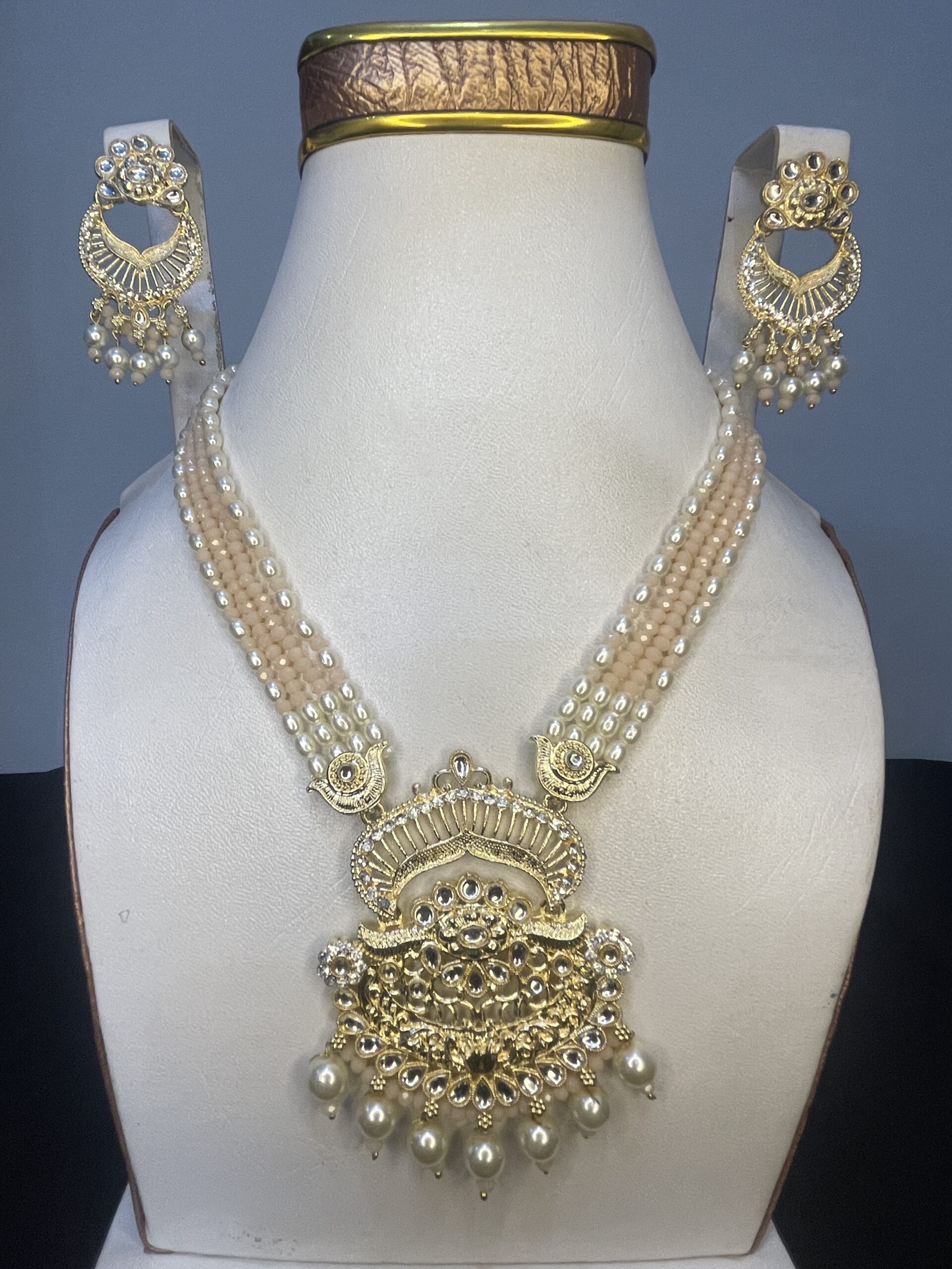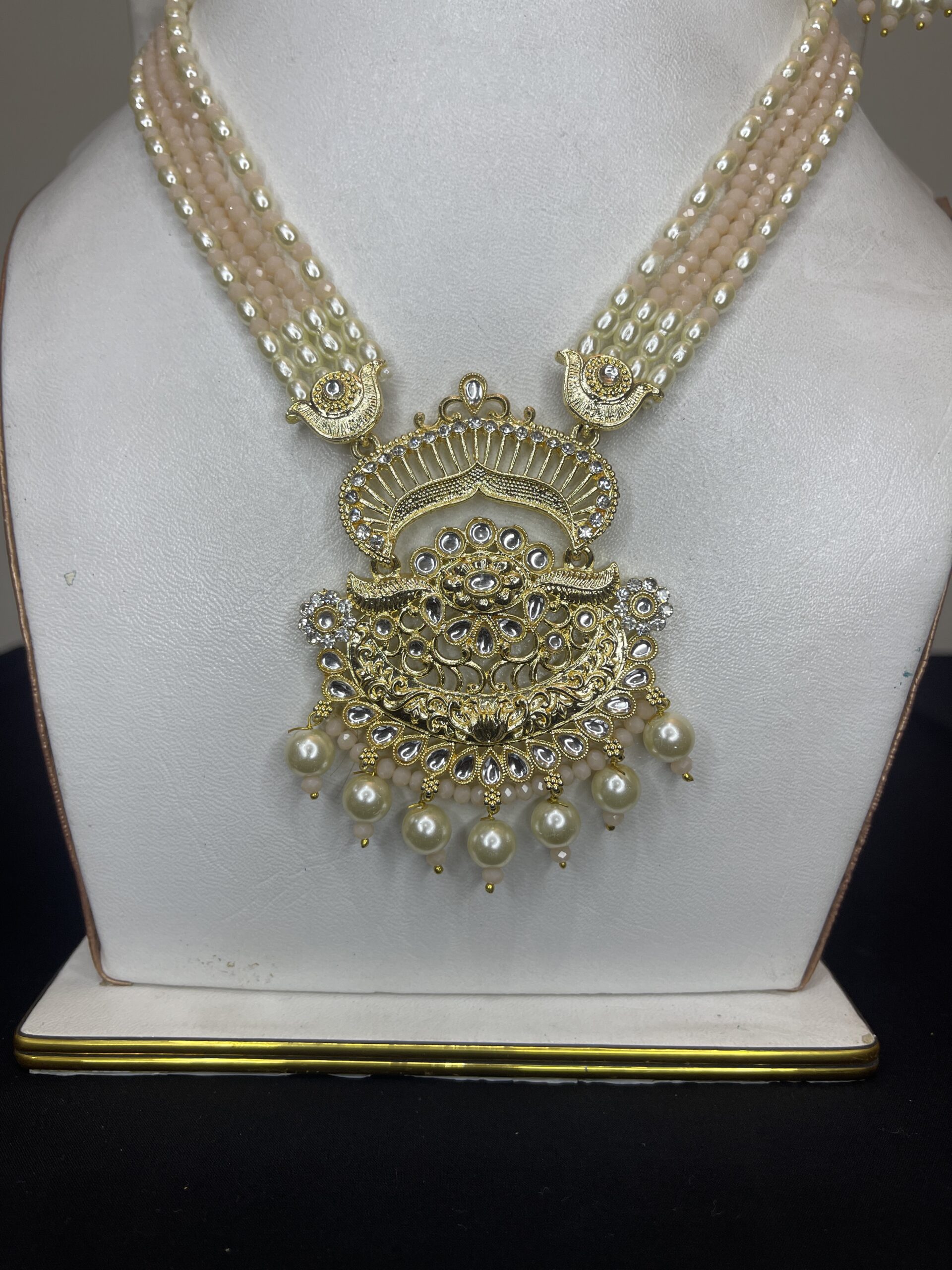 Bring a touch of timeless beauty to your look with this elegant necklace set. Designed with soft pearl and peach bead strands, it gracefully frames the neckline while leading to a stunning antique golden pendant. The centerpiece is detailed with sparkling stones and delicate pearl drops that create a royal, graceful vibe.