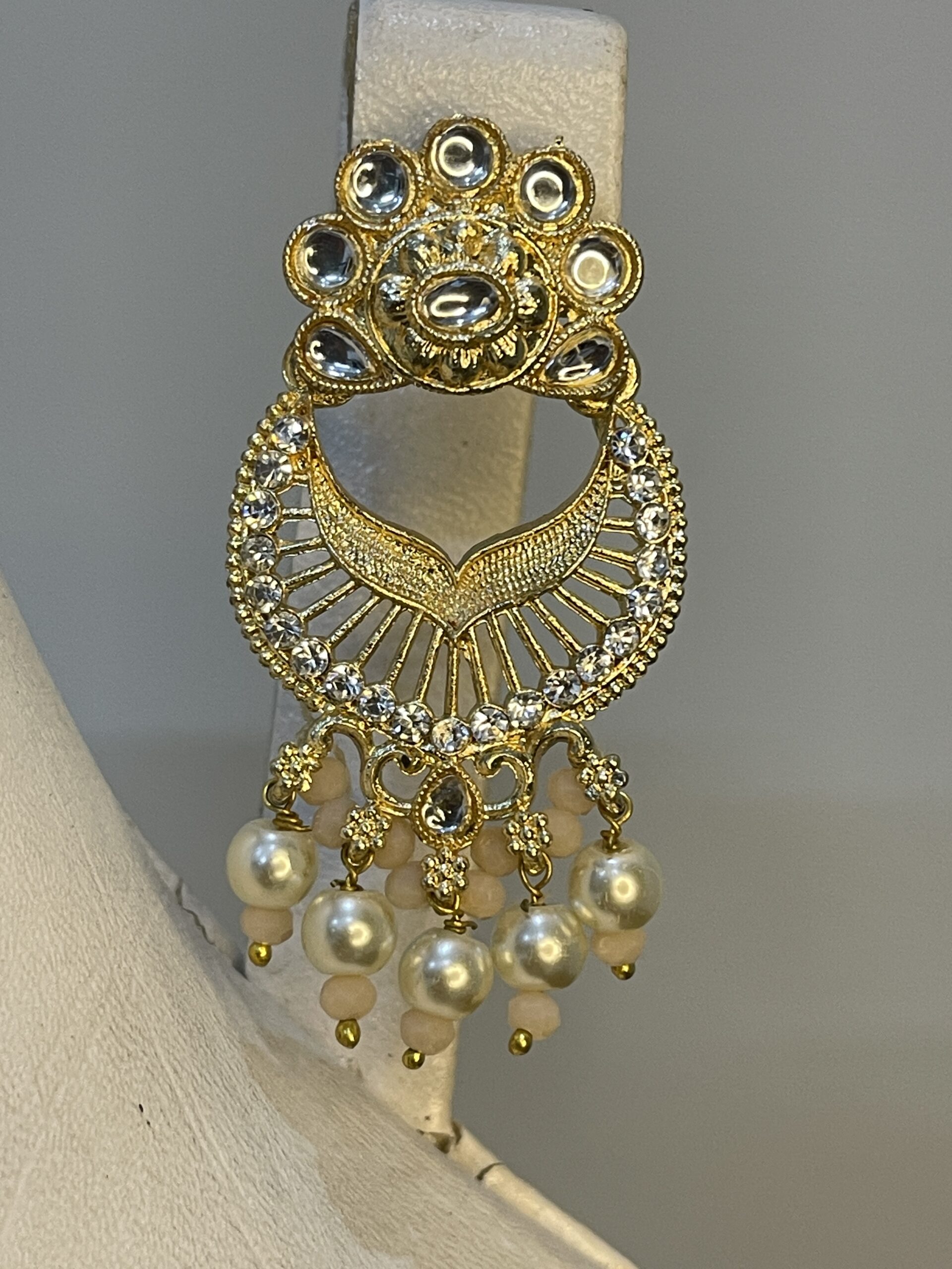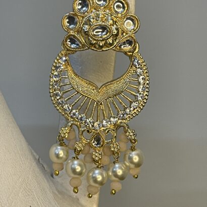 To enhance the look a pair of matching earrings designed with the same golden-tone finish, shimmering stones, and pearl dangling—perfectly tying your look together. Whether it’s a wedding, festive celebration, or a special family occasion, this set is made to make you shine.
