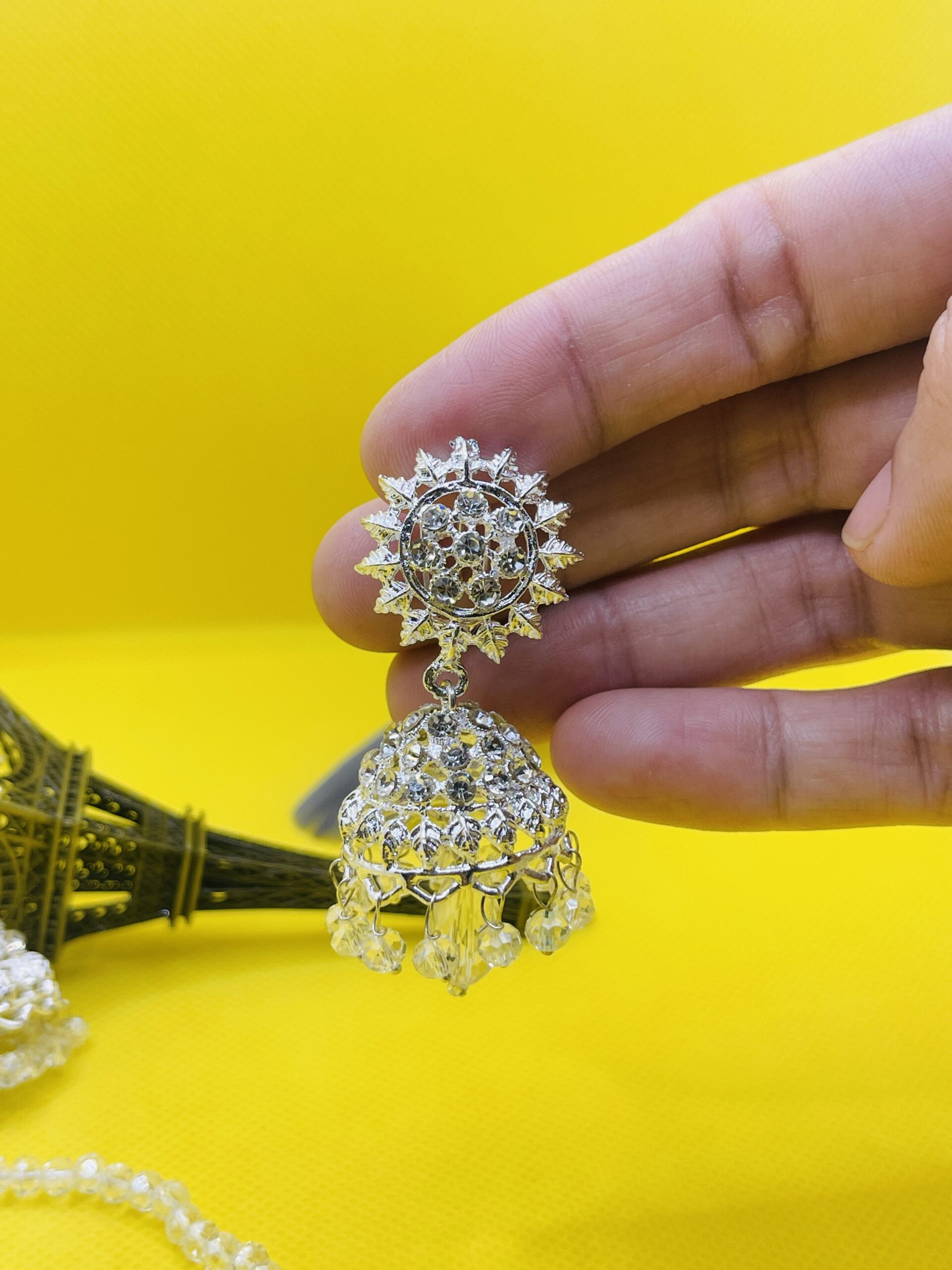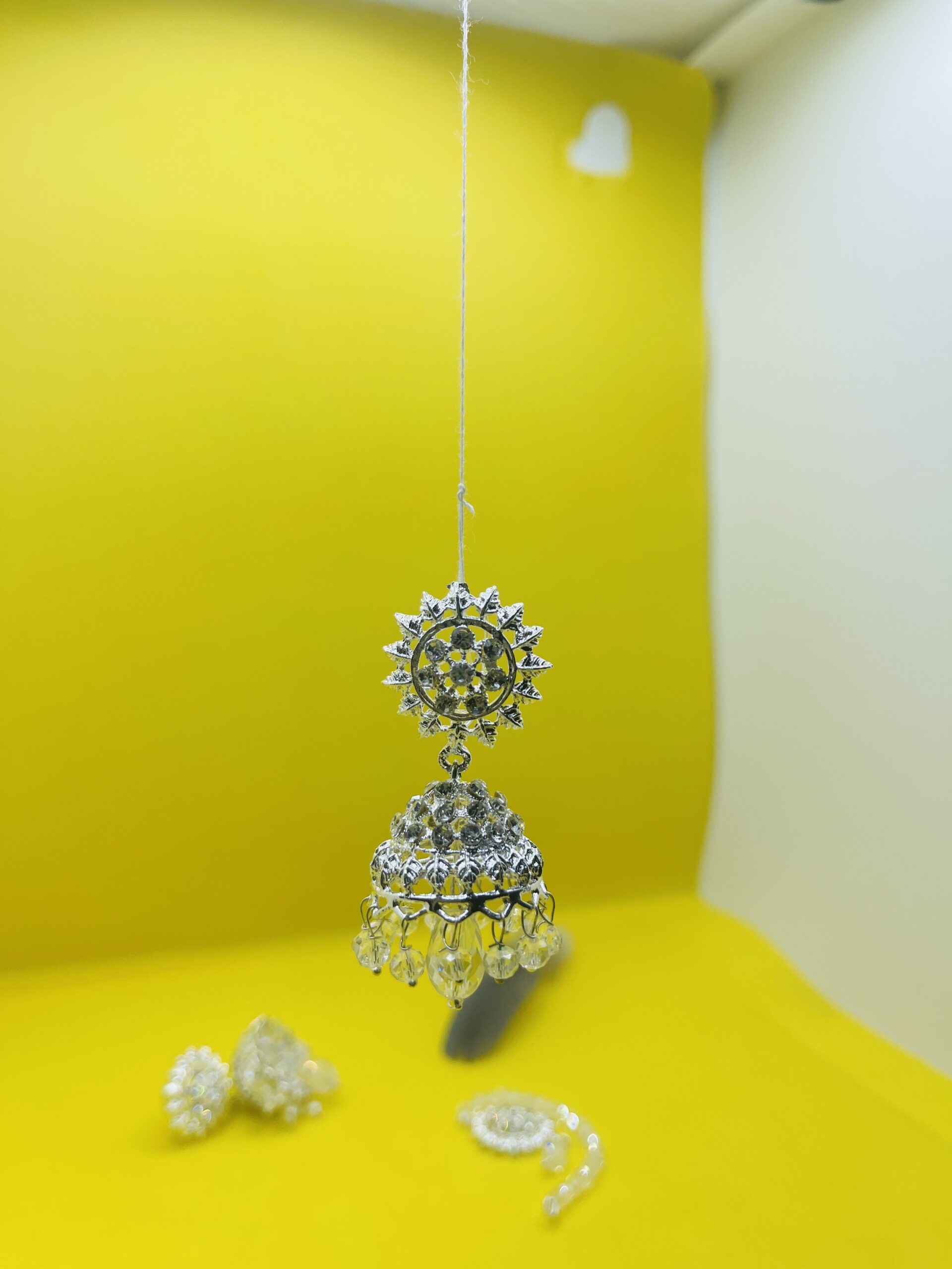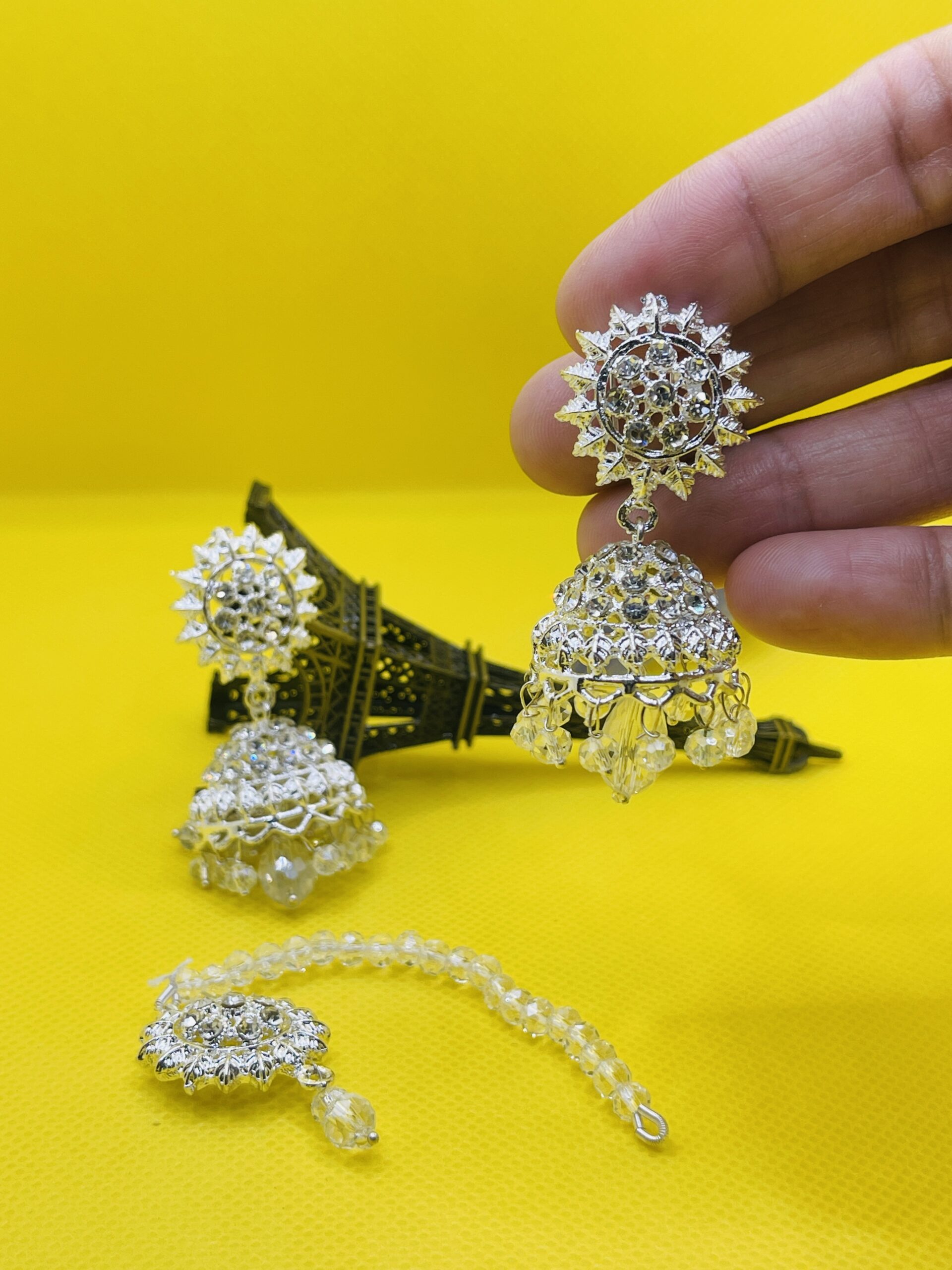 Chic silver jhumka earrings with a matching maang tikka, decorated with sparkling crystals. Perfect for parties, festive occasions, and traditional outfits.