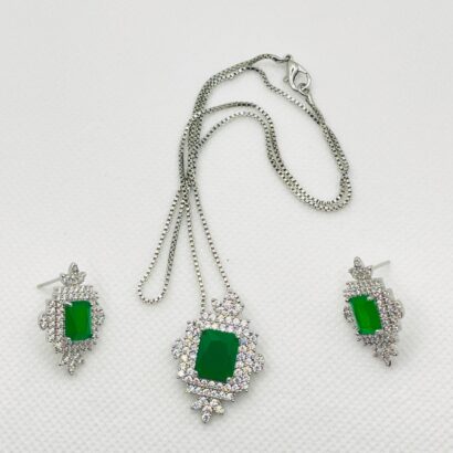 dd a touch of regal elegance to your ensemble with this stunning Emerald Green Crystal Jewelry Set. This matching set includes a beautiful rectangular emerald-cut green crystal pendant and coordinating stud earrings, both framed by a double halo of shimmering white micro-crystals. Set in a polished silver-tone finish with an ornate, vintage-inspired border, this set is perfect for formal events, weddings, or as a sophisticated gift for a loved one.