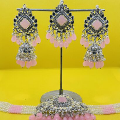 Style & Occasion: The vibrant baby pink beads and the oxidized silver-tone finish create a striking, regal look. This set is a must-have for Bridesmaids, Mehendi ceremonies, Sangeet nights, Eid celebrations, Diwali, and any significant South Asian wedding function. It offers a beautiful fusion of traditional craftsmanship and contemporary flair.