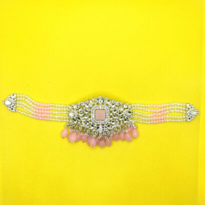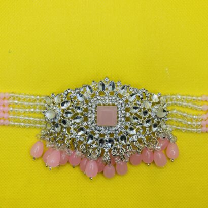 Choker Necklace: A statement choker with a central geometric pendant, heavily embellished with pink teardrop-shaped beads that gracefully hang along the bottom. The necklace strap is a delicate arrangement of white and pink beads.