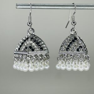 This three-piece set is crafted in an opulent, traditional Indian/Pakistani Kundan-style. The base metal is beautifully silver-plated and features intricate detailing with embedded sparkling white/clear accent stones.