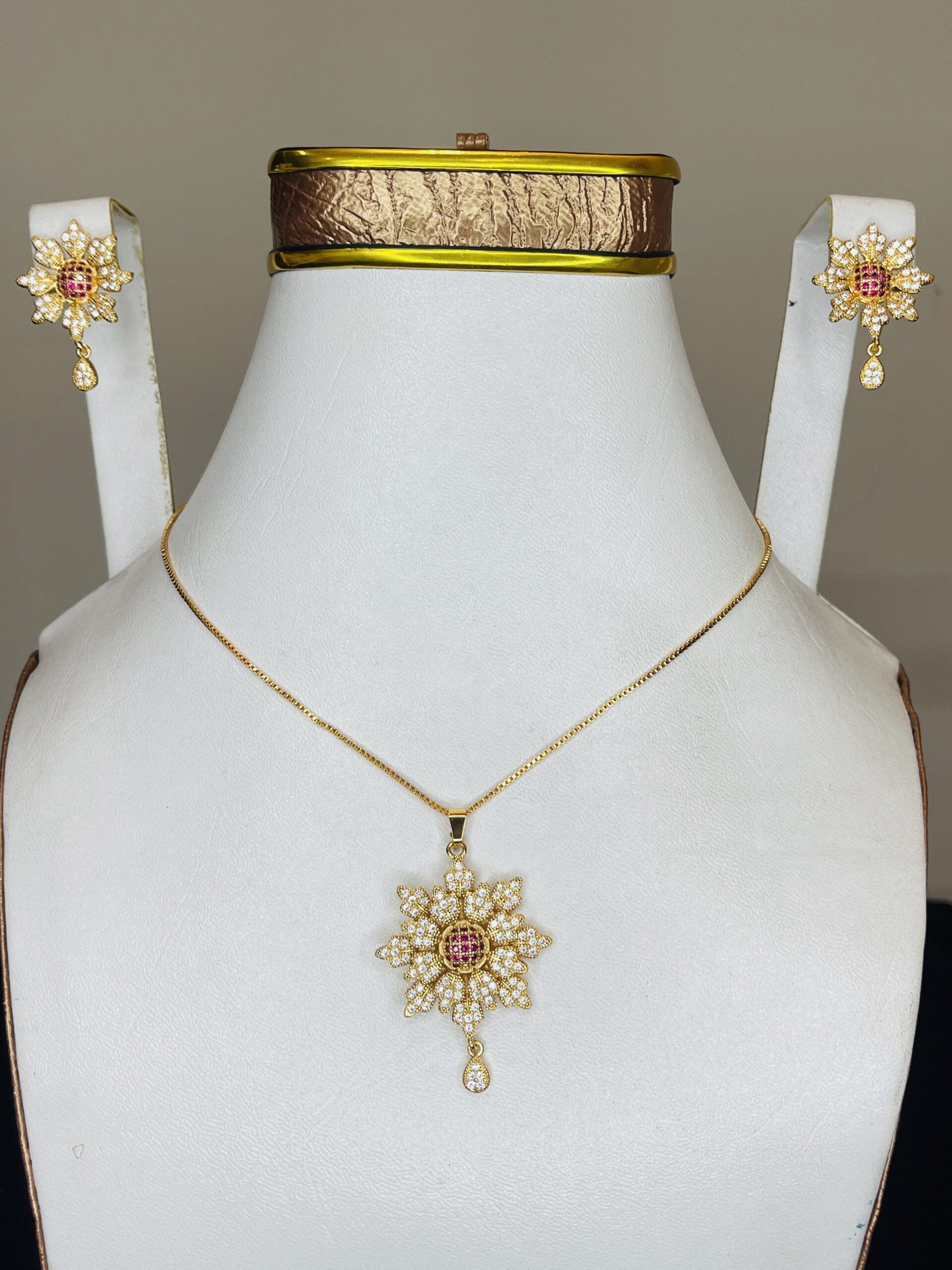 “A timeless floral pendant crafted with a radiant ruby centerpiece and sparkling stones – perfect for weddings, parties, or gifting elegance that lasts forever.”