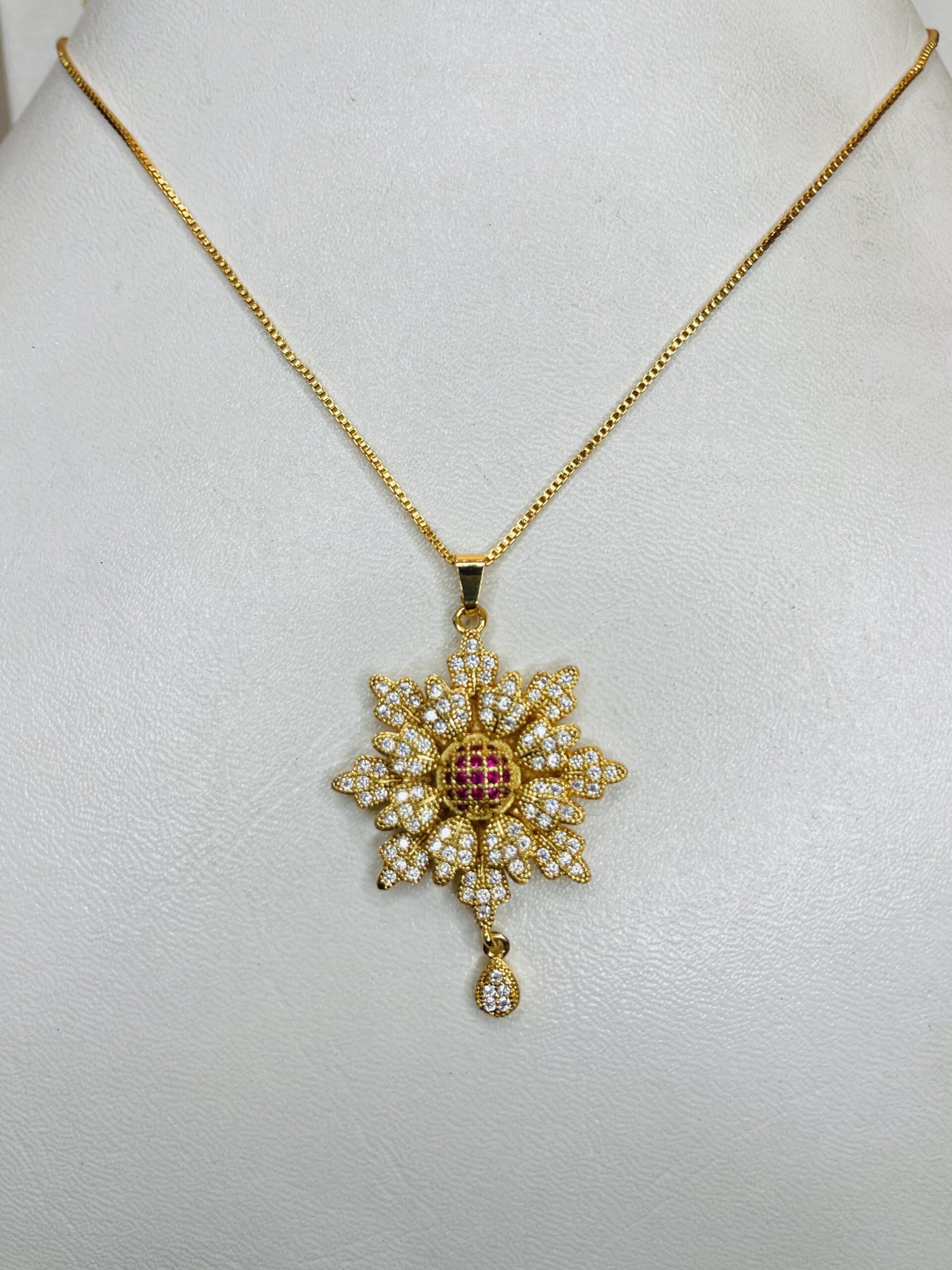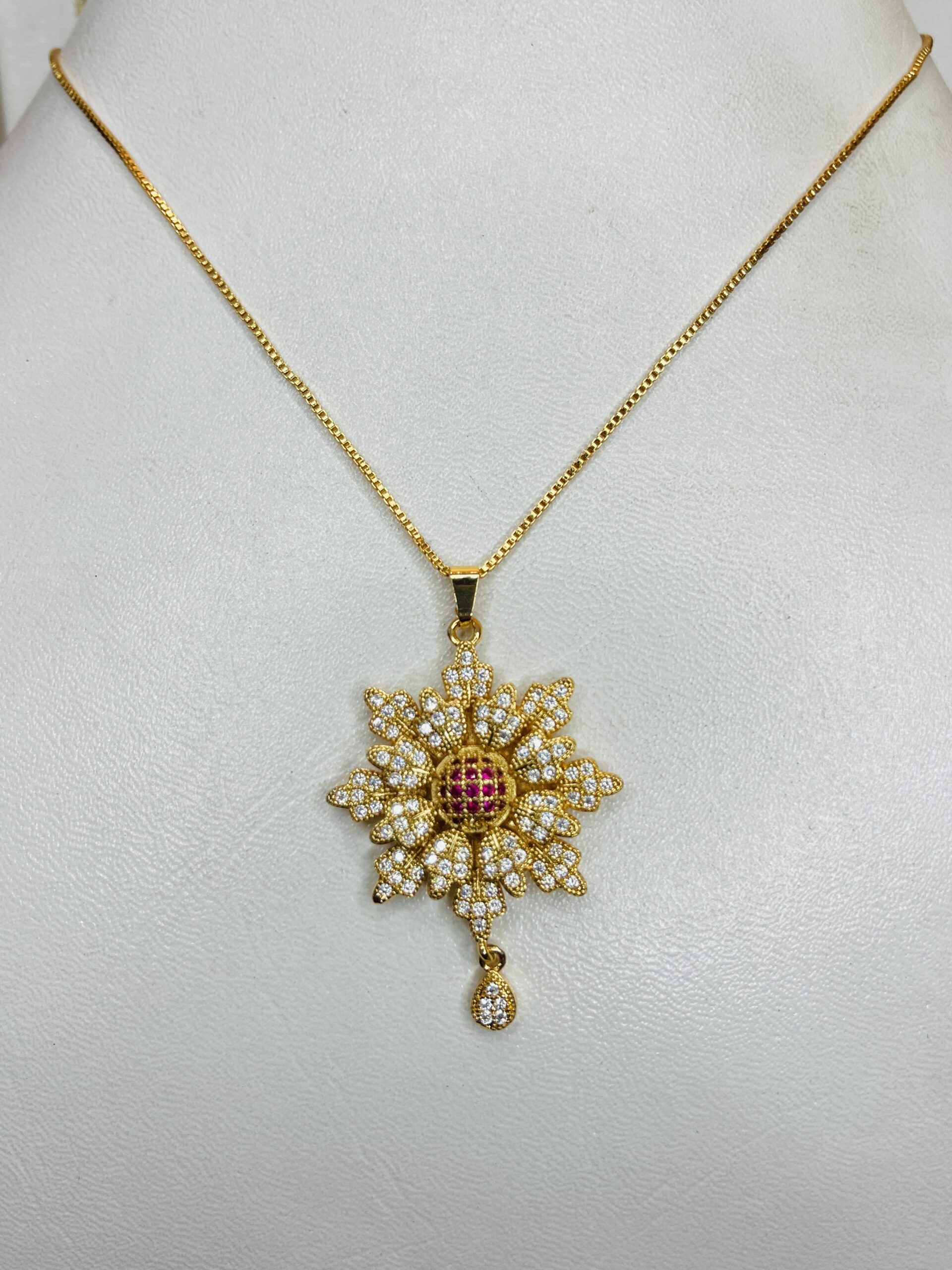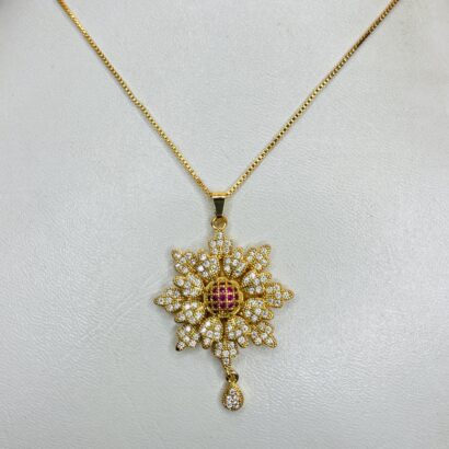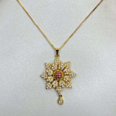 This stunning floral pendant necklace is crafted with precision to add a touch of timeless elegance to your collection. The pendant features a brilliant flower design, encrusted with sparkling white stones and highlighted by a radiant ruby-red centerpiece. A delicate teardrop charm enhances its graceful look, making it an ideal choice for weddings, festive occasions, or everyday sophistication. Designed to shine beautifully with any outfit, this necklace is the perfect blend of tradition and luxury.