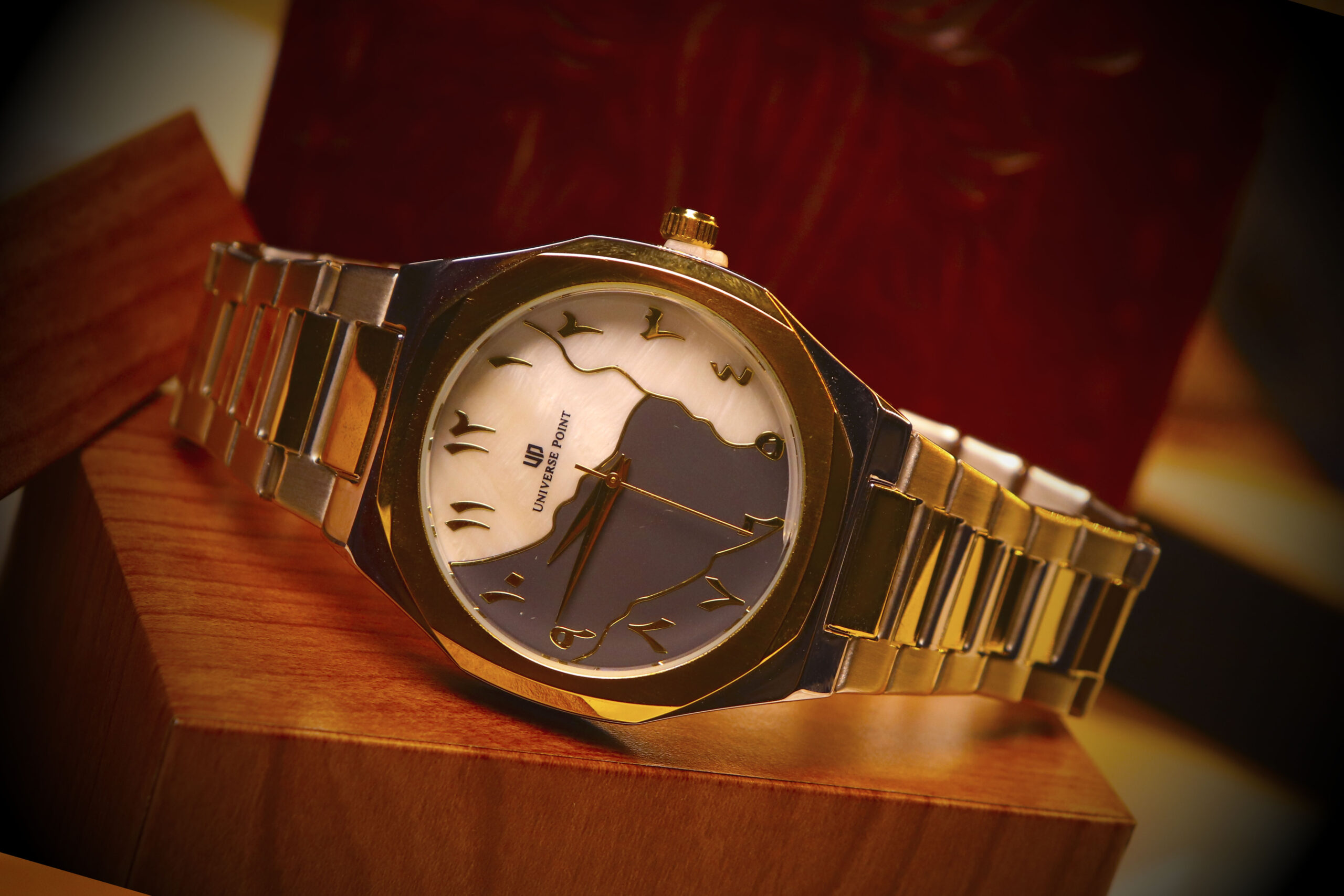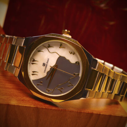 Discover a timepiece that transcends conventional design – the Universe Point Art-Dial Watch. This captivating watch features a truly unique dial, reminiscent of a serene landscape where mountain peaks meet an open sky, or perhaps abstract artistic brushstrokes. The distinctive gold-toned Arabic numerals gracefully follow the contours of the design, adding an elegant cultural touch.