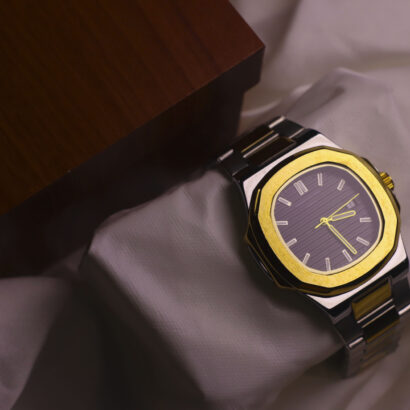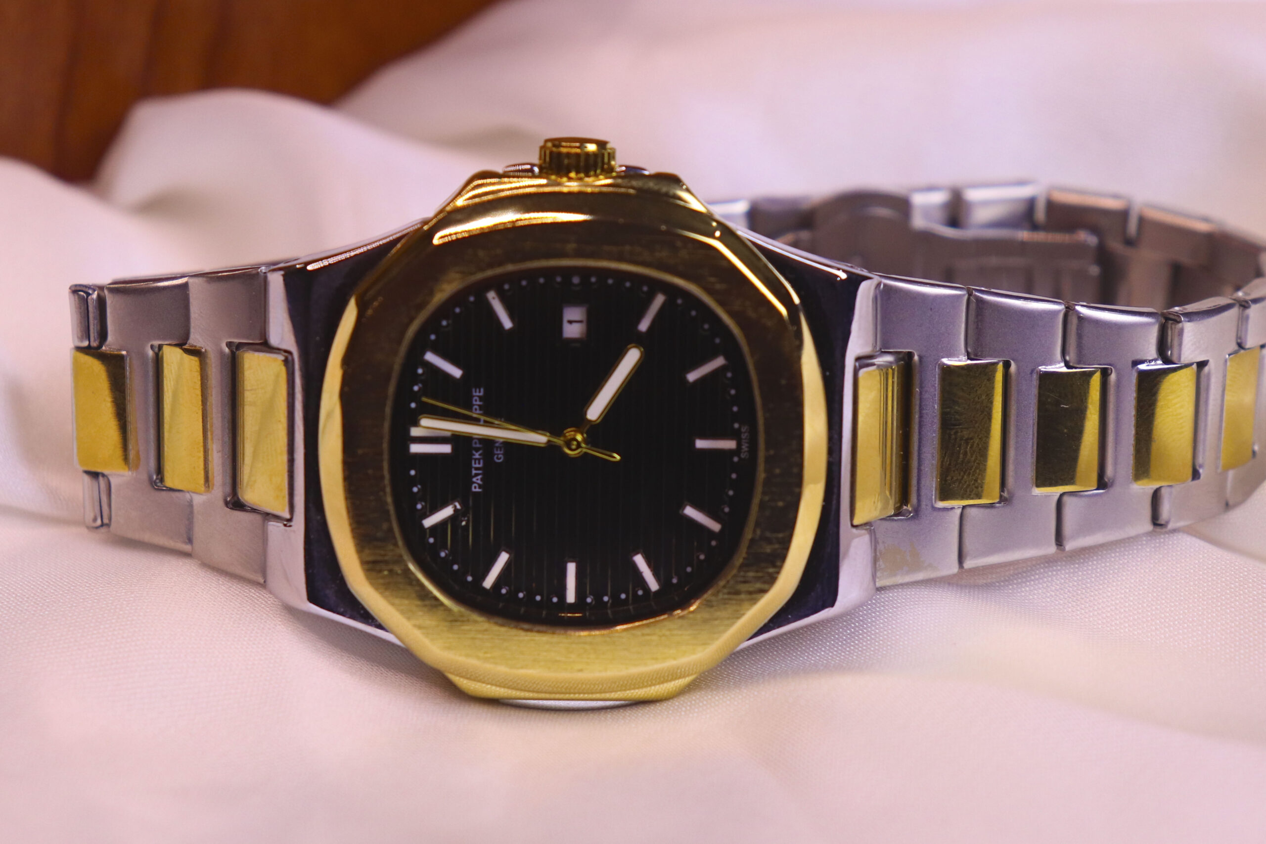 Description: “A close-up shot of a Patek Philippe Geneva watch featuring a black dial with horizontal lines, silver hour markers, and a gold bezel. The watch has a silver and gold band, adding to its luxurious look. Perfect blend of elegance and sophistication 💼✨.