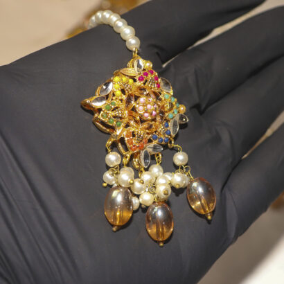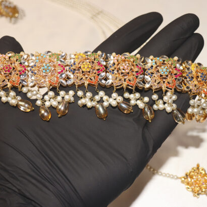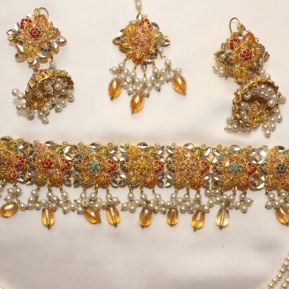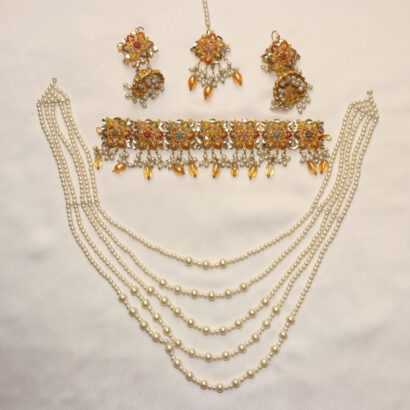 Adorn yourself in timeless elegance with our breathtaking Royal Radiance Bridal Set. This exquisite ensemble captures the grandeur of traditional craftsmanship, featuring a stunning Kundan choker intricately detailed with vibrant enamel accents and delicate amber-hued drops. Complementing the choker are matching Jhumka earrings, a graceful Tikka, and an elaborate five-strand pearl Mala (necklace). Each piece is meticulously crafted, showcasing lustrous pearls and sparkling Kundan work that radiates regal charm. Perfect for brides, special occasions, or anyone wishing to embrace the rich heritage of South Asian jewelry. Elevate your look with this captivating set that promises to turn heads and create unforgettable memories.