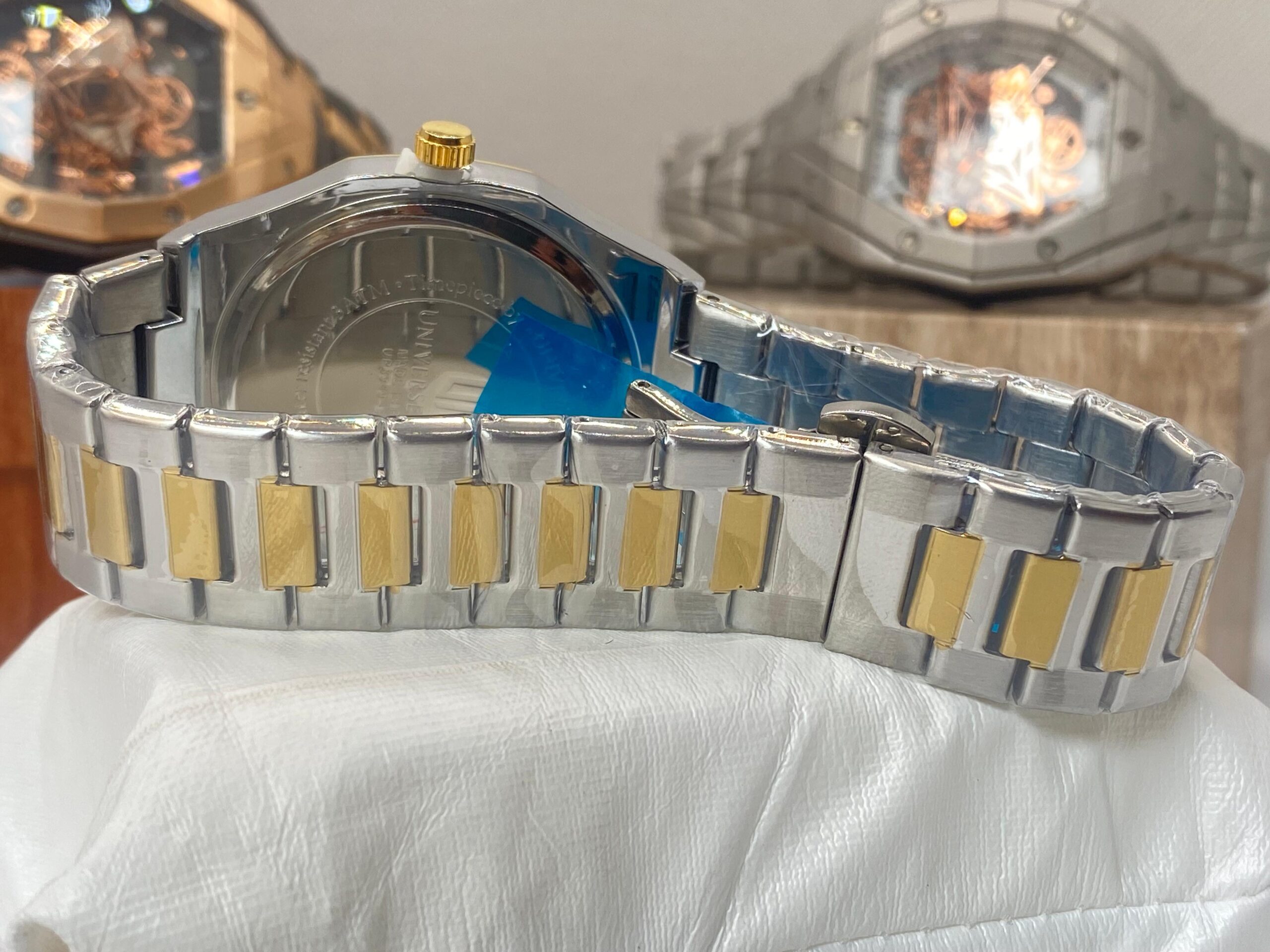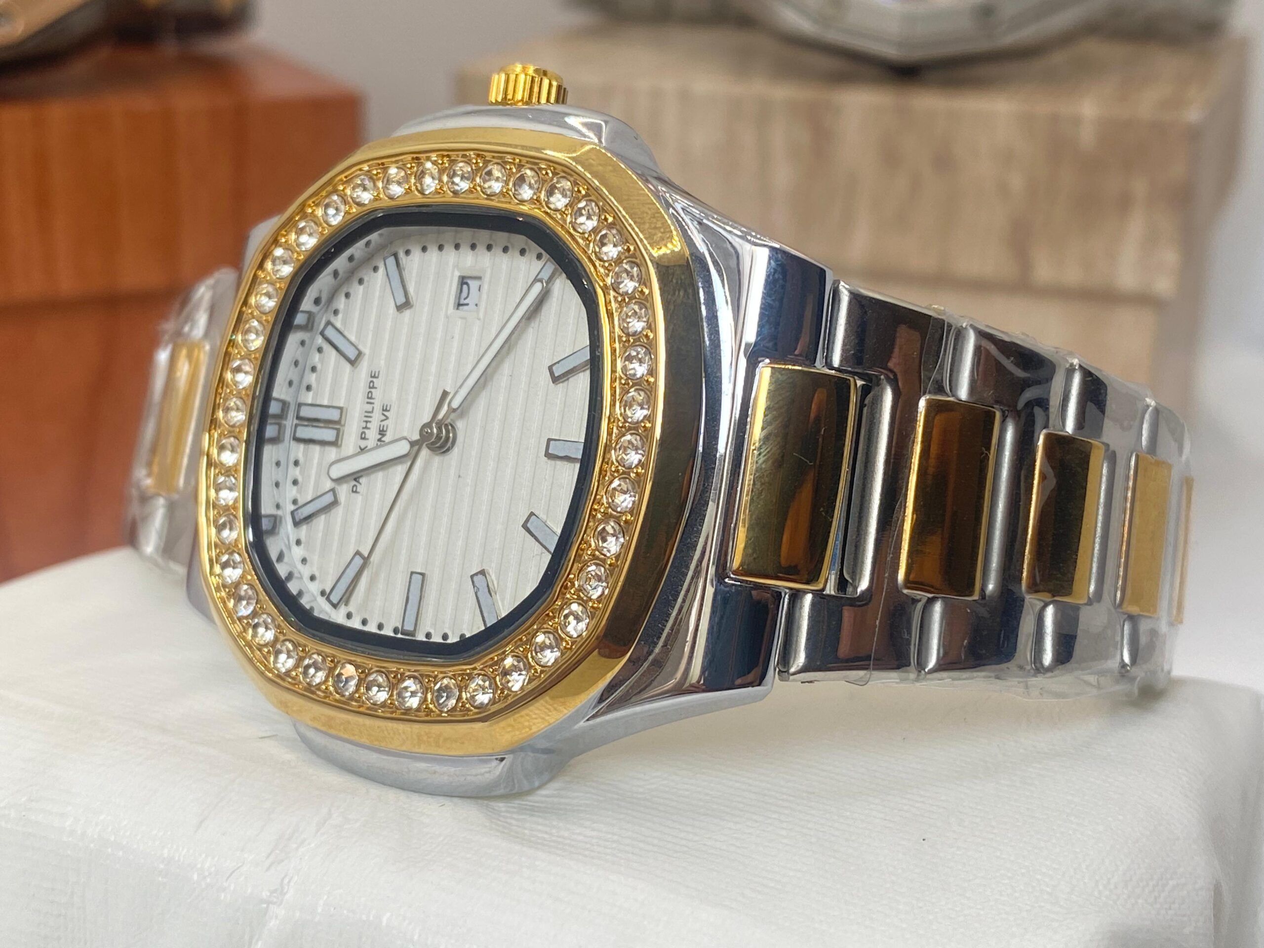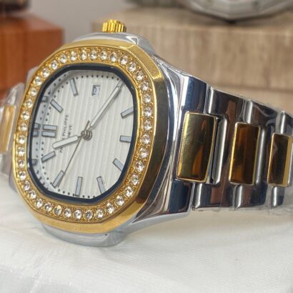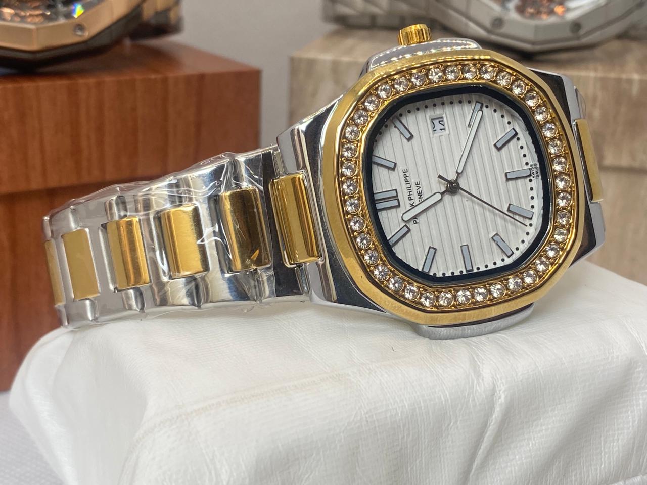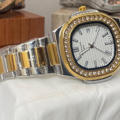 Check out this gorgeous Patek Philippe Geneve watch! 😍 With its sleek silver and gold design, diamond-encrusted bezel, and elegant white dial, this piece is a true symbol of luxury and style. 💼💎 Perfect for those who appreciate fine timepieces!