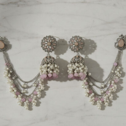 Designed for the modern woman who cherishes traditional aesthetics, this pair features a classic floral stud that descends into an intricately crafted silver dome (Jhumka). The oxidized silver finish provides a vintage allure, perfectly contrasting with the softness of the blush-pink stones and cascading white pearl clusters