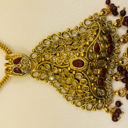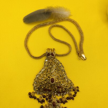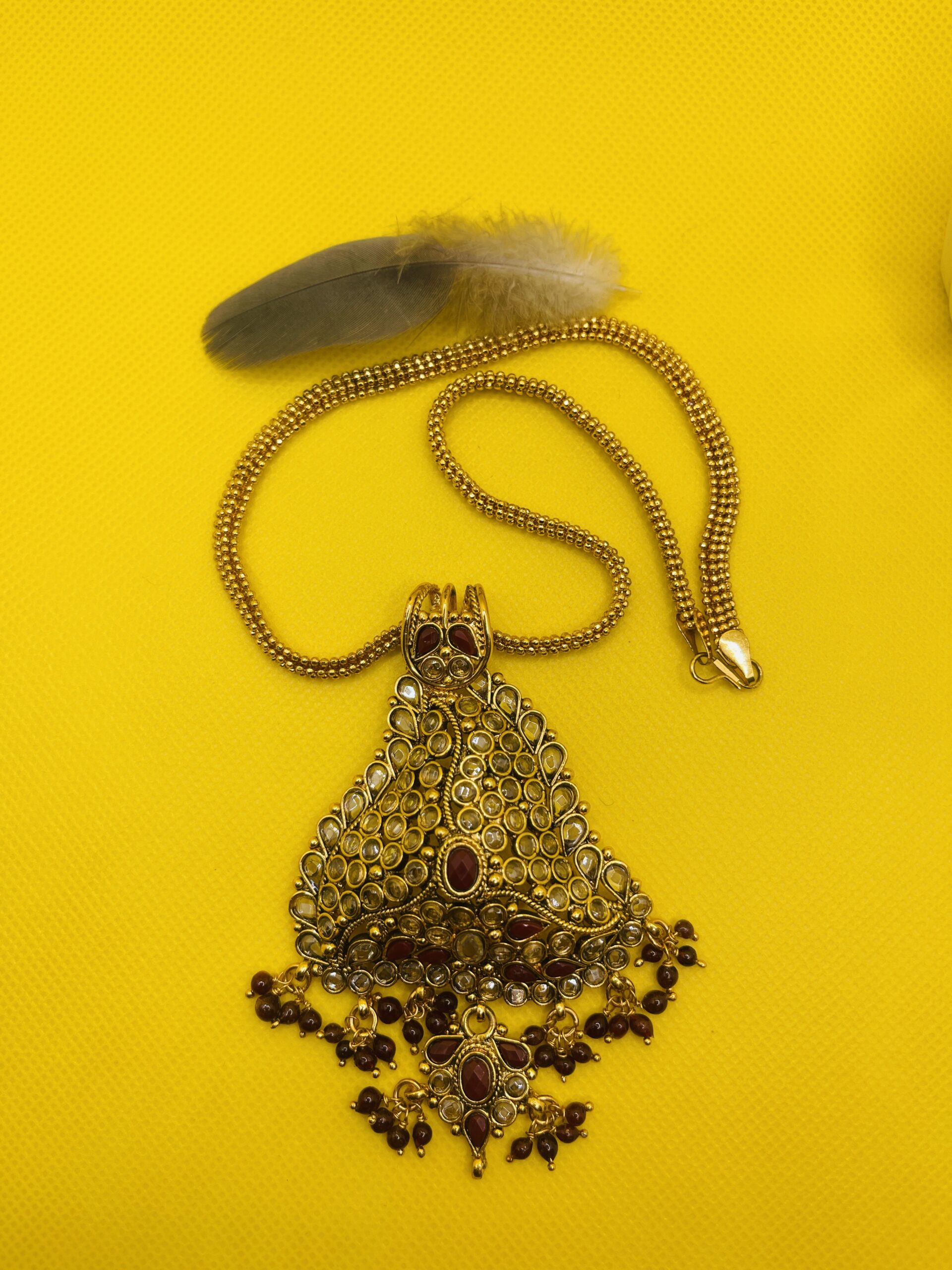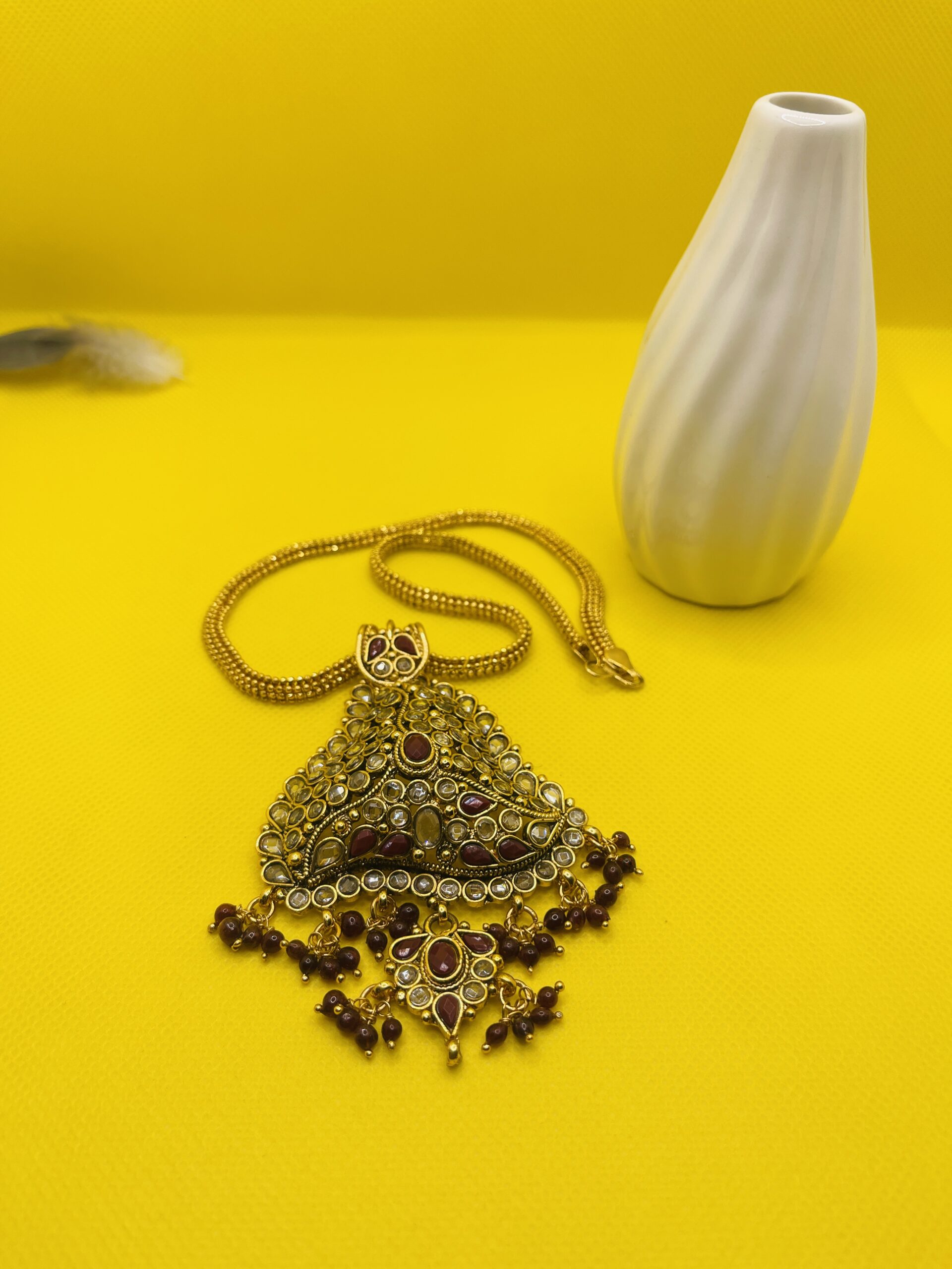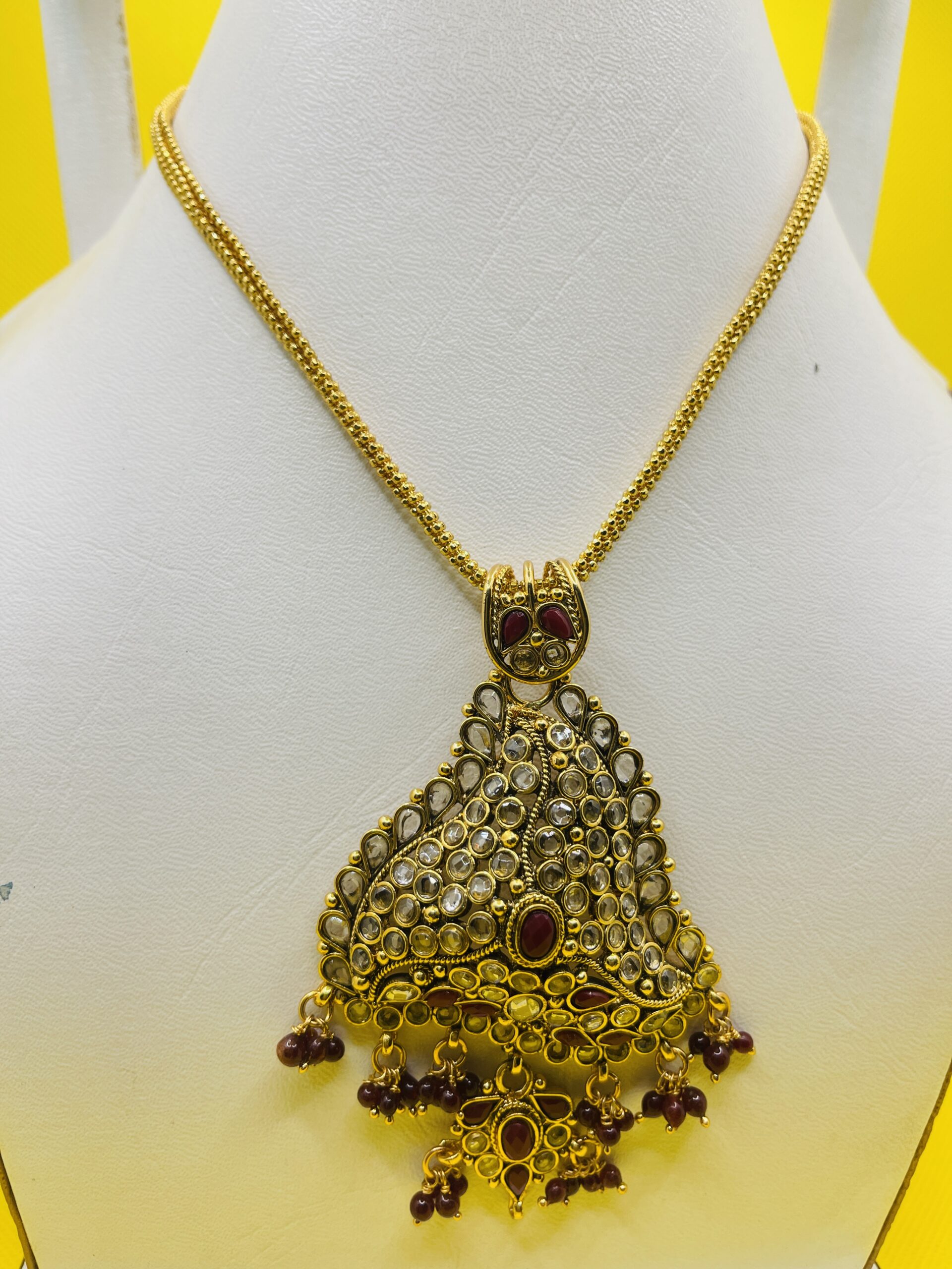 Enhance your ethnic charm with this traditional kundan pendant necklace, beautifully designed with fine detailing and vibrant accents. The pendant showcases intricate craftsmanship with clear kundan stones, highlighted by red gemstones and dangling bead drops for a graceful finishing touch.