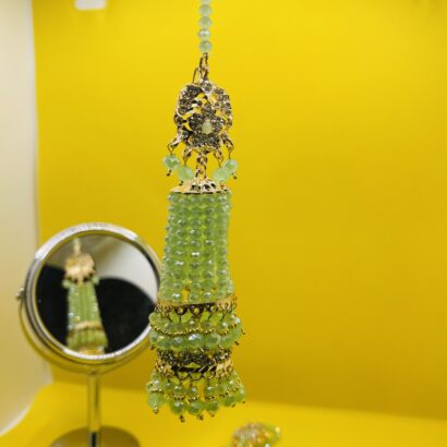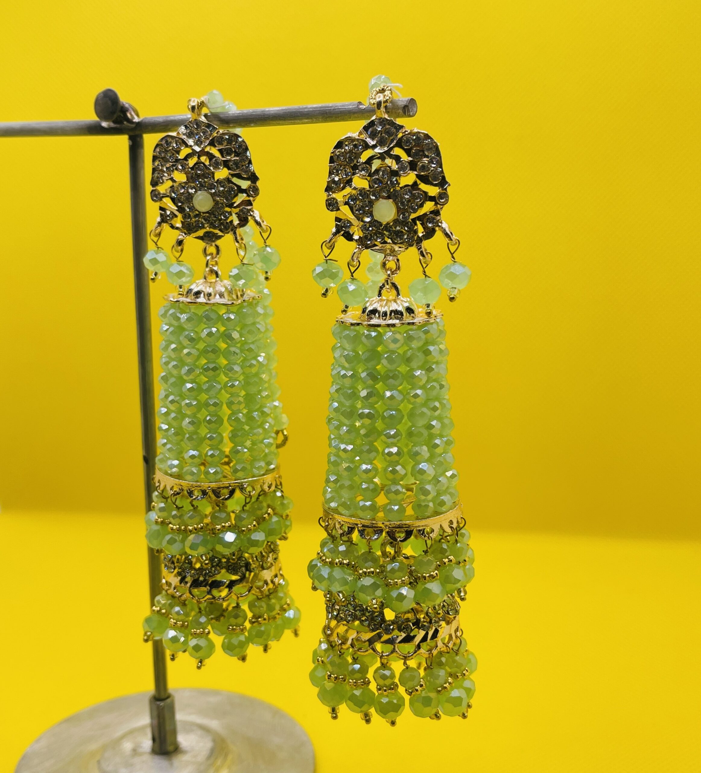 The top of the earring showcases an intricate, floral-inspired dark metal stud adorned with subtle embellishments, adding a touch of sophisticated contrast. Beneath the main jhumka, multiple layers of matching green beads dangle freely, enhancing movement and sparkle. Ideal for Mehendi ceremonies, Sangeet functions, festive occasions, or pairing with traditional South Asian attire, these long jhumkas will instantly elevate your look with their dazzling color and dramatic length.