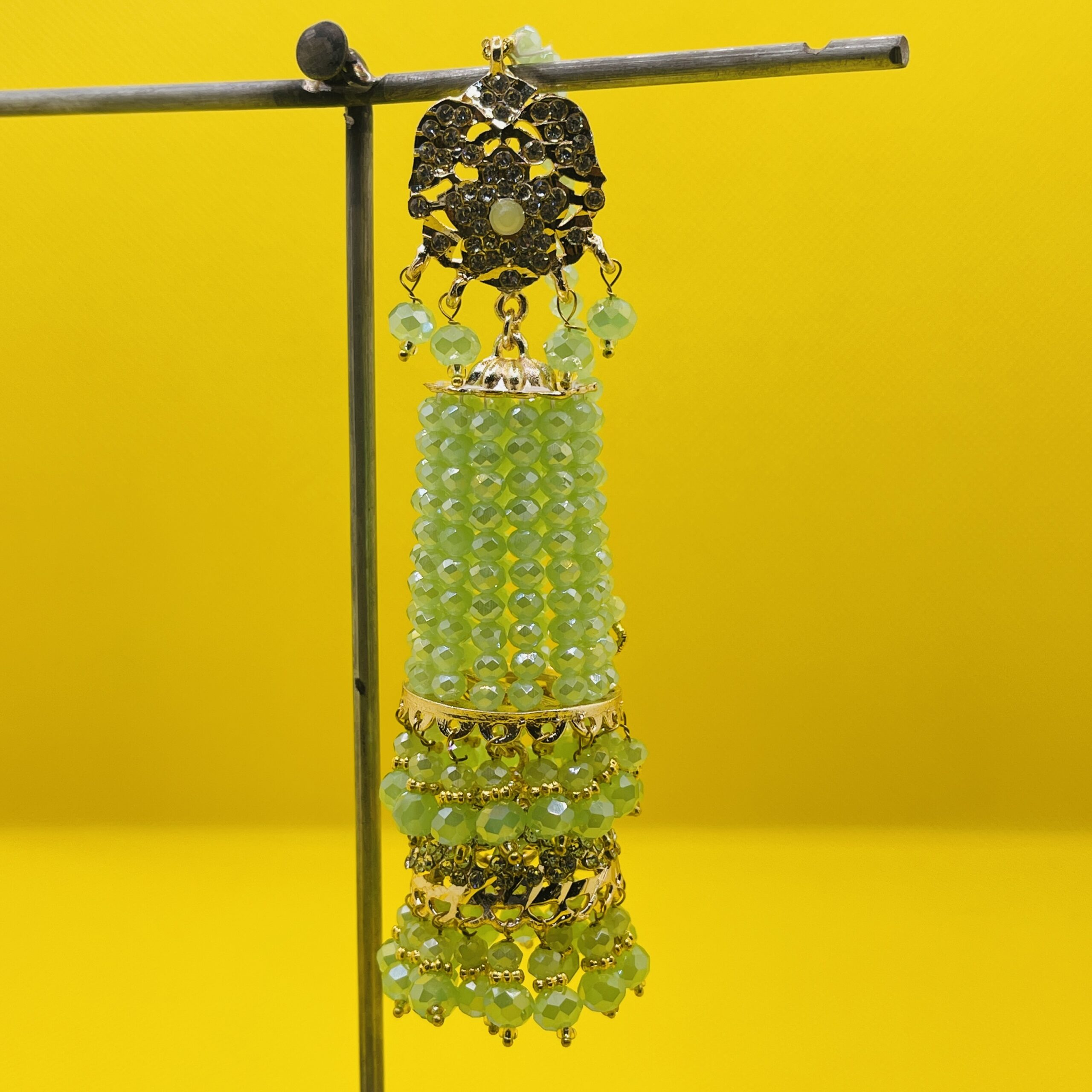 Make a vibrant and elegant statement with these striking long green beaded jhumka earrings. These traditional bell-shaped earrings feature an extended, cylindrical body meticulously crafted from numerous strands of sparkling, light green crystal beads. The rich, lime-green color is framed by antique gold-toned metalwork, creating a perfect balance of tradition and modern flair.