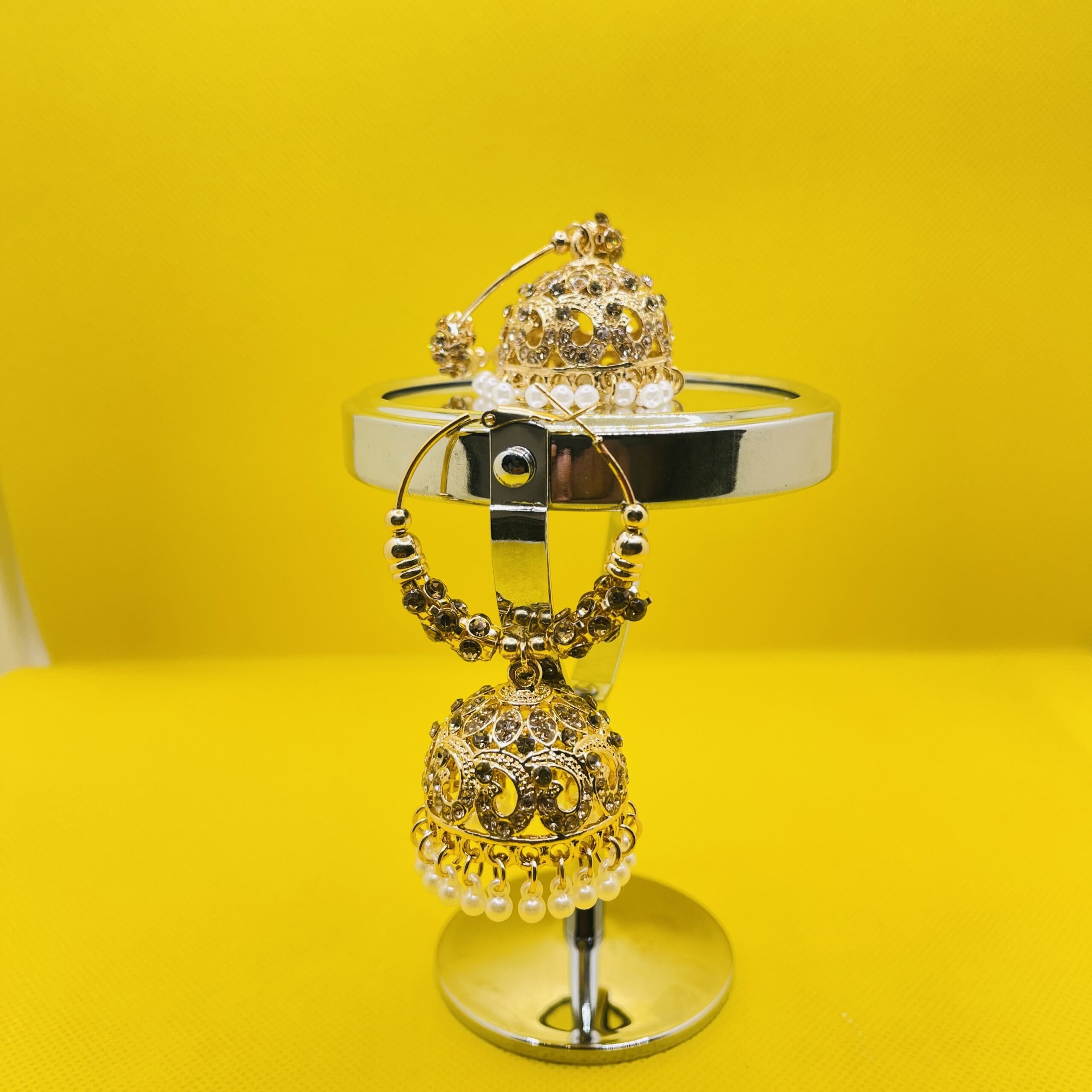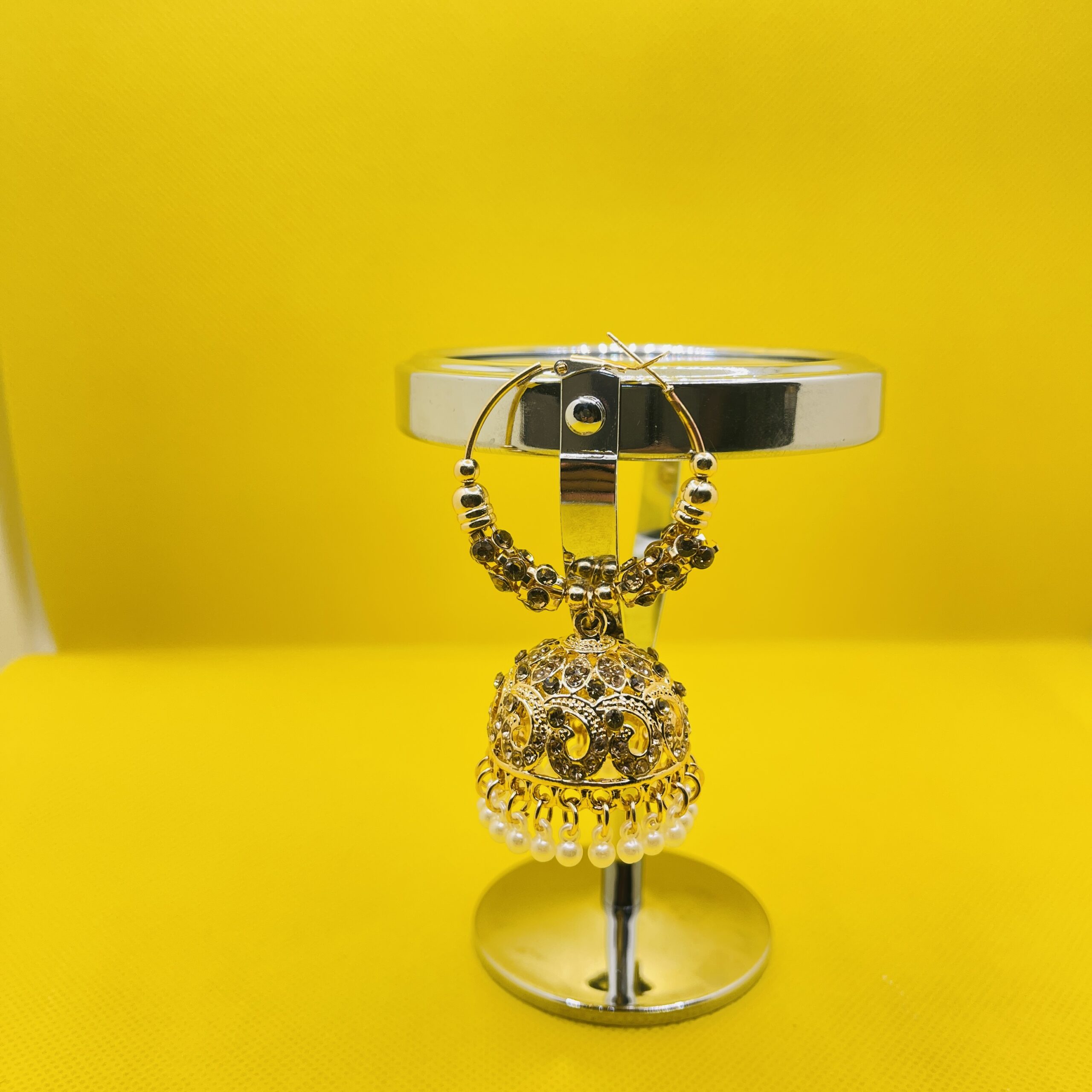 Elegant and vibrant, these traditional Indian-style Jhumka hoop earrings feature intricate gold-tone filigree, shimmering crystal embellishments, and a delicate fringe of white pearls. Set against a bold yellow backdrop, they are the perfect fusion of classic heritage and modern charm.